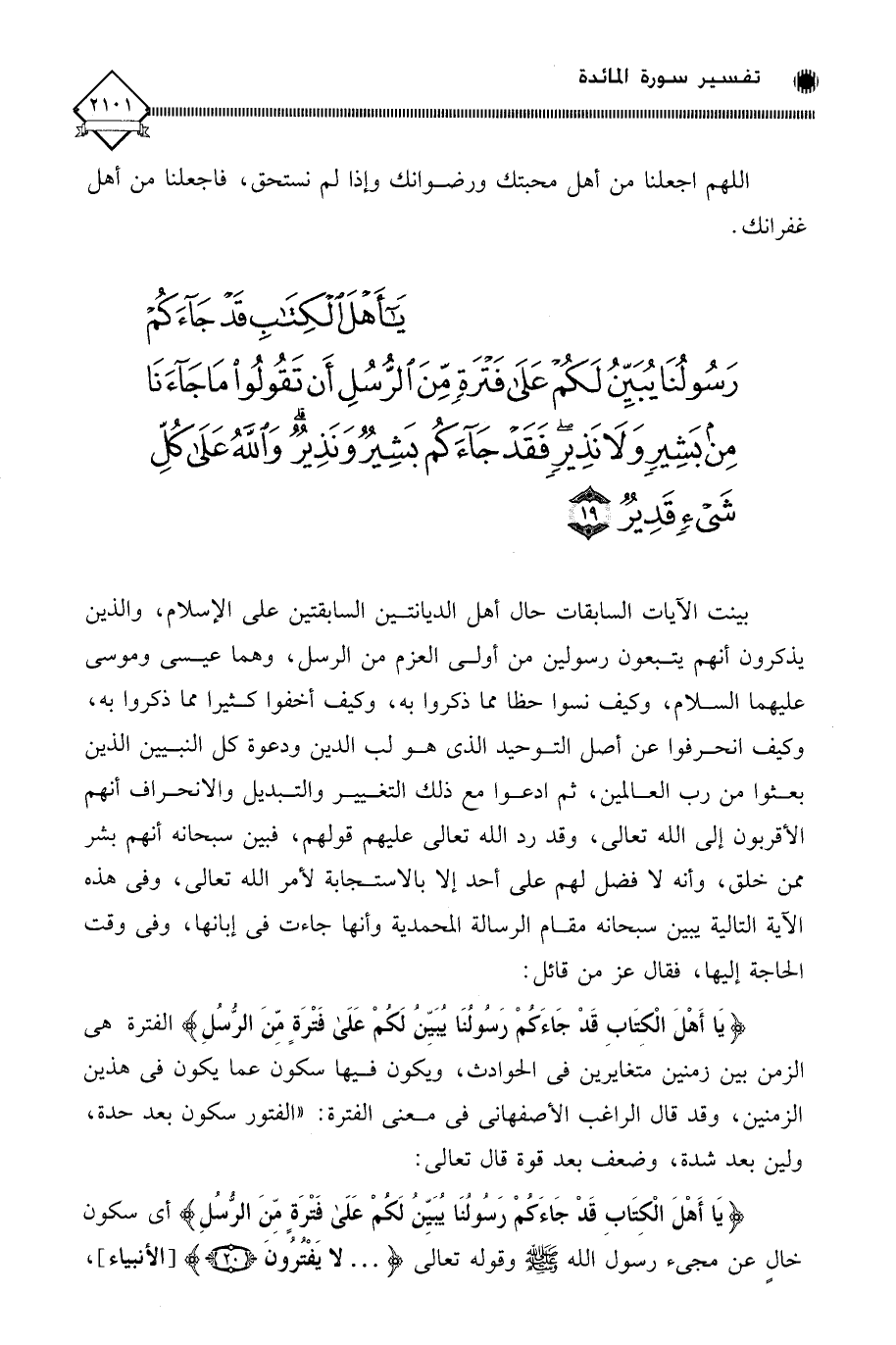 (يَا أَهْلَ الْكِتَابِ قَدْ جَاءَكُمْ رَسُولُنَا يُبَيِّنُ لَكُمْ عَلَى فَتْرَةٍ مِنَ الرُّسُلِ أَنْ تَقُولُوا مَا جَاءَنَا مِنْ بَشِيرٍ وَلَا نَذِيرٍ فَقَدْ جَاءَكُمْ بَشِيرٌ وَنَذِيرٌ وَاللَّهُ عَلَى كُلِّ شَيْءٍ قَدِيرٌ (19)