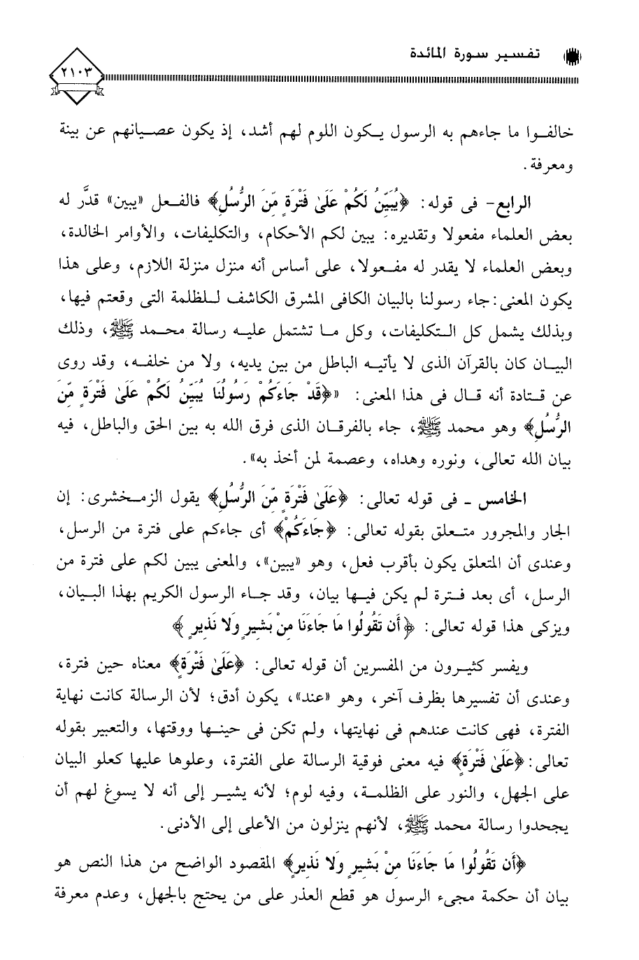 الرابع - في قوله: (يُبَيِّنُ لَكُمْ عَلَى فَتْرَةٍ مِنَ الرُّسُلِ) فالفعل " يبين " قدَّر له بعض العلماء مفعولا وتقديره: يبين لكم الأحكام، والتكليفات، والأوامر الخالدة، وبعض العلماء لَا يقدر له مفعولا، على أساس أنه منزل منزلة اللازم، وعلى هذا يكون المعنى: جاء رسولنا بالبيان الكافي المشرق الكاشف للظلمة التي وقعتم فيها، وبذلك يشمل كل التكليفات، وكل ما تشتمل عليه رسالة محمد - صلى الله عليه وسلم -، وذلك البيان كان بالقرآن الذي لَا يأتيه الباطل من بين يديه، ولا من خلفه، وقد روي عن قتادة أنه قال في هذا المعنى: " (قَدْ جَاءَكُمْ رَسُولُنَا يُبَيِّنُ لَكُمْ عَلَى فَتْرَةٍ مِّنَ الرُّسُلِ) وهو محمد - صلى الله عليه وسلم -، جاء بالفرقان الذي فردا الله به بين الحق والباطل، فيه بيان الله تعالى، ونوره وهداه، وعصمة لمن أخذ به ".