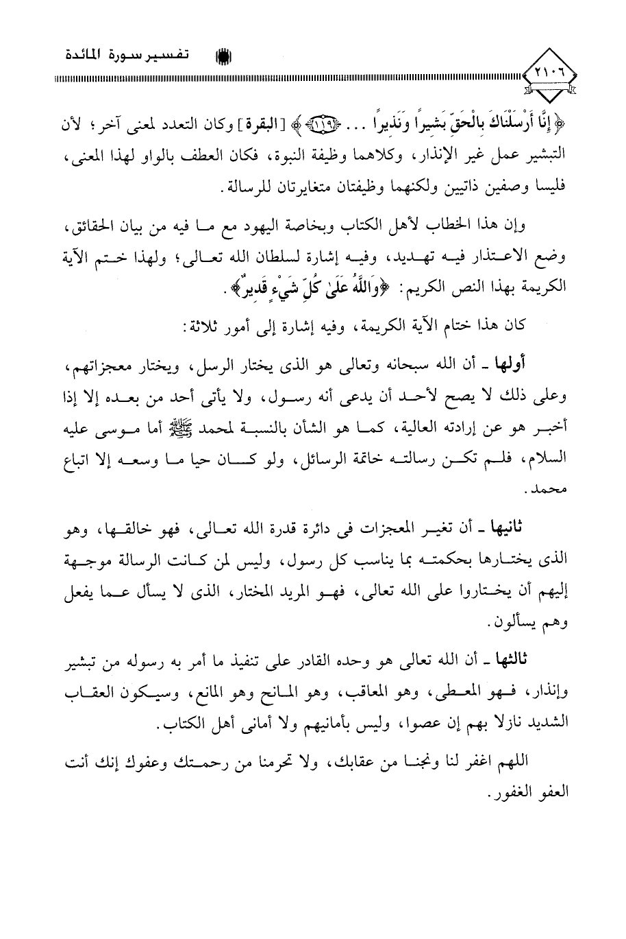 ثالثها - أن الله تعالى هو وحده القادر على تنفيذ ما أمر به رسوله من تبشير وإنذار، فهو المعطي، وهو المعاقب، وهو المانح وهو المانع، وسيكون العقاب الشديد نازلا بهم إن عصوا، وليس بأمانيهم ولا أماني أهل الكتاب.