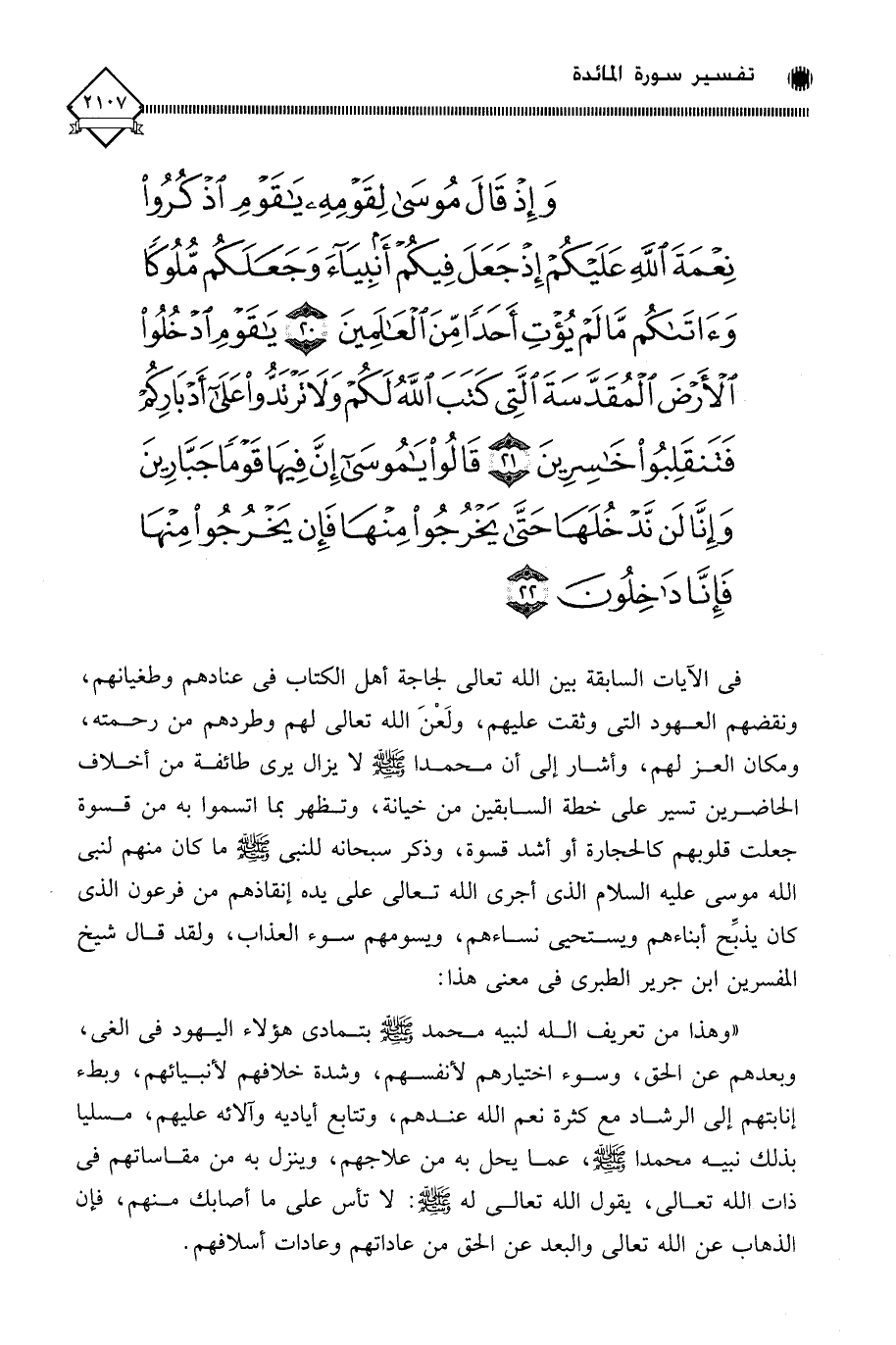 (وَإِذْ قَالَ مُوسَى لِقَوْمِهِ يَا قَوْمِ اذْكُرُوا نِعْمَةَ اللَّهِ عَلَيْكُمْ إِذْ جَعَلَ فِيكُمْ أَنْبِيَاءَ وَجَعَلَكُمْ مُلُوكًا وَآتَاكُمْ مَا لَمْ يُؤْتِ أَحَدًا مِنَ الْعَالَمِينَ (20) يَا قَوْمِ ادْخُلُوا الْأَرْضَ الْمُقَدَّسَةَ الَّتِي كَتَبَ اللَّهُ لَكُمْ وَلَا تَرْتَدُّوا عَلَى أَدْبَارِكُمْ فَتَنْقَلِبُوا خَاسِرِينَ (21) قَالُوا يَا مُوسَى إِنَّ فِيهَا قَوْمًا جَبَّارِينَ وَإِنَّا لَنْ نَدْخُلَهَا حَتَّى يَخْرُجُوا مِنْهَا فَإِنْ يَخْرُجُوا مِنْهَا فَإِنَّا دَاخِلُونَ (22)