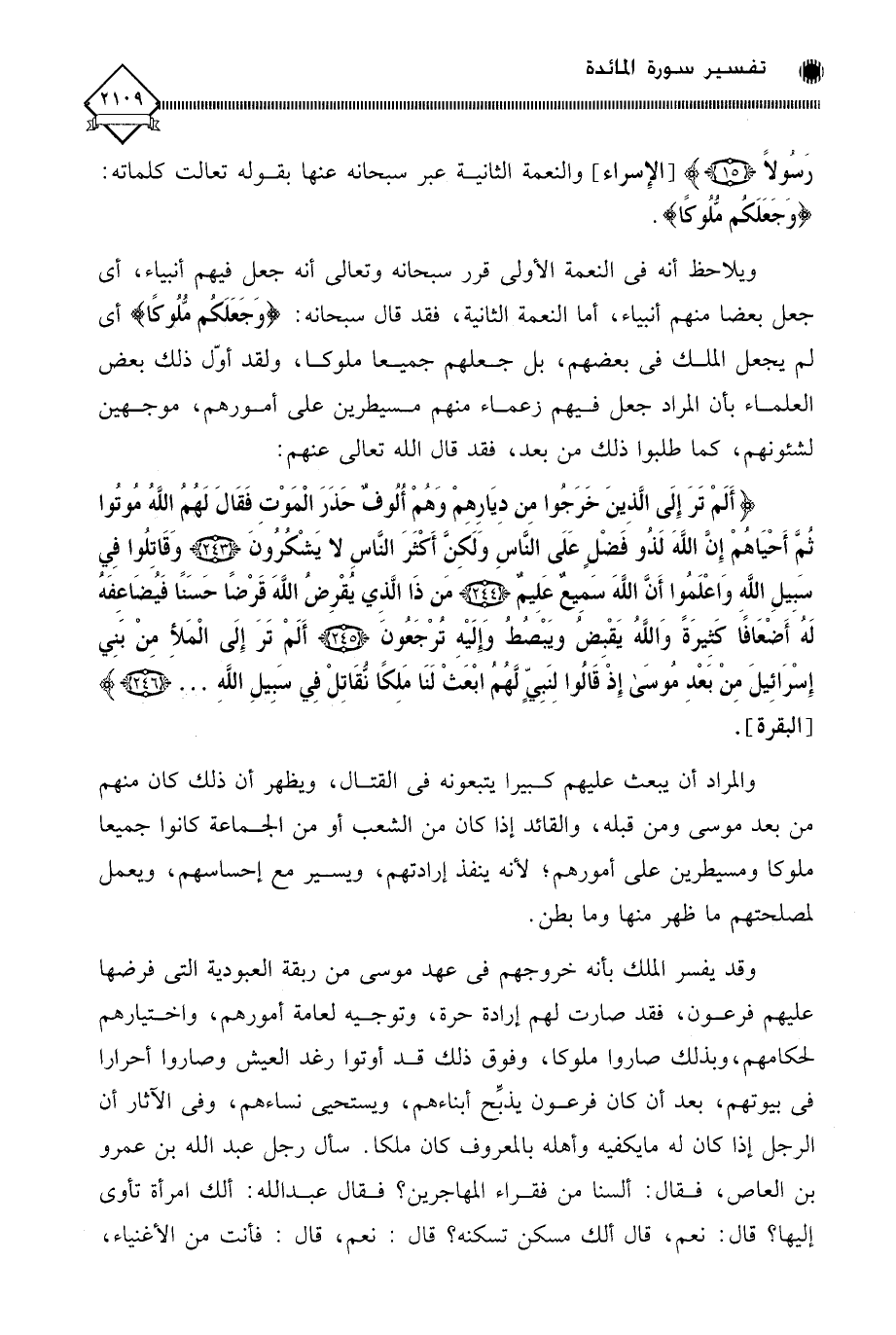 ويلاحظ أنه في النعمة الأولى قرر سبحانه وتعالى أنه جعل فيهم أنبياء، أي جعل بعضا منهم أنبياء، أما النعمة الثانية، فقد قال سبحانه: (وَجَعَلَكُم مُّلُوكًا) أي لم يجعل الملك في بعضهم، بل جعلهم جميعا ملوكا، ولقد أوّل ذلك بعض العلماء بأن المراد جعل فيهم زعماء منهم مسيطرين على أمورهم، موجهين لشئونهم، كما طلبوا ذلك من بعد، فقد قال الله تعالى عنهم: