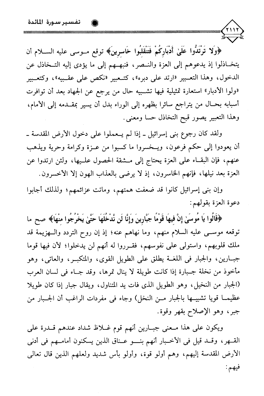(وَلَا تَرْتَدُّوا عَلَى أَدْبَارِكُمْ فَتَنْقَلِبُوا خَاسِرِينَ) توقع موسى عليه السلام أن يتخاذلوا إذ يدعوهم إلى العزة والنصر، فنبههم إلى ما يؤدي إليه التخاذل عن الدخول، وهذا التعبير " ارتد على دبره "، كتعبير " نكص على عقبيه "، وكتعبير " ولوا الأدبار " استعارة تمثيلية فيها تشبيه حال من يرجع عن الجهاد بعد أن توافرت أسبابه بحال من يتراجع سائرا بظهره إلى الوراء بدل أن يسير بمقدمه إلى الأمام، وهذا التعبير يصور قبح التخاذل حسا ومعنى.