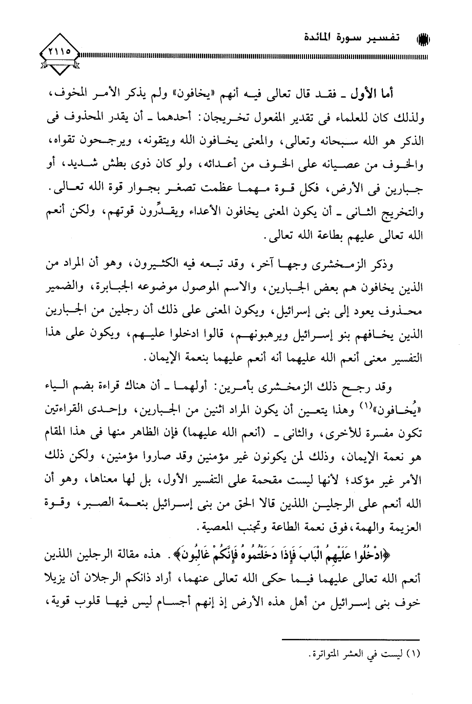 وقد رجح ذلك الزمخشري بأمرين: أولهما - أن هناك قراءة بضم الياء " يُخافون " (¬1) وهذا يتعين أن يكون المراد اثنين من الجبارين، وإحدى القراءتين تكون مفسرة للأخرى، والثاني - (أنعم الله عليهما) فإن الظاهر منها في هذا المقام هو نعمة الإيمان، وذلك لمن يكونون غير مؤمنين وقد صاروا مؤمنين، ولكن ذلك الأمر غير مؤكد؛ لأنها ليست مقحمة على التفسير الأول، بل لها معناها، وهو أن الله أنعم على الرجلين اللذين قالا الحق من بني إسرائيل بنعمة الصبر، وقوة العزيمة والهمة، فوق نعمة الطاعة وتجنب المعصية.