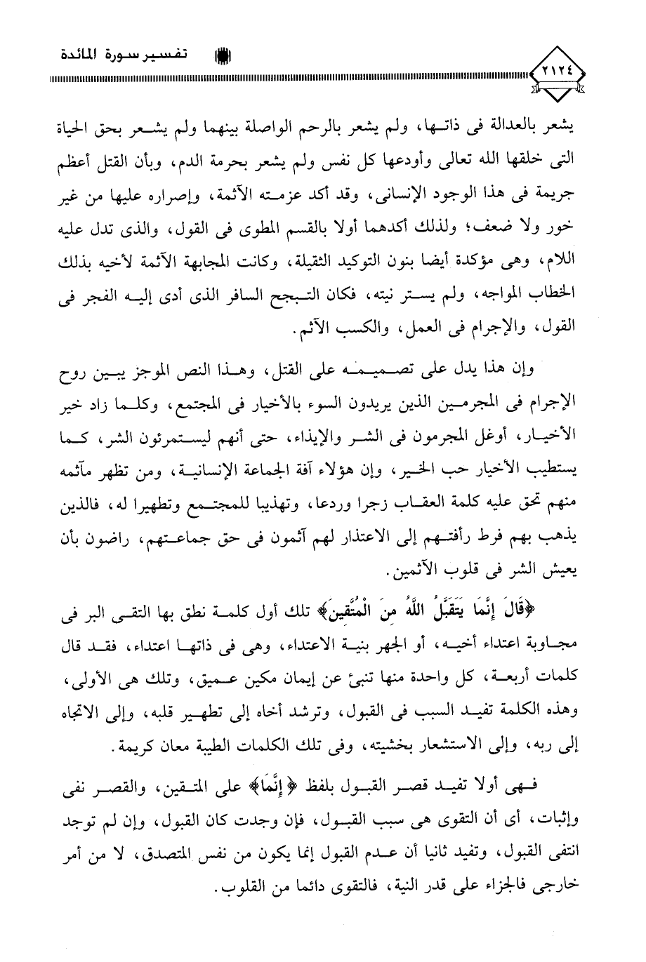 (قَالَ إِنَّمَا يَتَقَبَّلُ اللَّهُ مِنَ الْمُتَّقِينَ) تلك أول كلمة نطق بها التقي البر في مجاوبة اعتداء أخيه، أو الجهر بنية الاعتداء، وهي في ذاتها اعتداء، فقد قال كلمات أربعة، كل واحدة منها تنبئ عن إيمان مكين عميق، وتلك هي الأولى، وهذه الكلمة تفيد السبب في القبول، وترشد أخاه إلى تطهير قلبه، وإلى الاتجاه إلى ربه، وإلى الاستشعار بخشيته، وفي تلك الكلمات الطيبة معان كريمة.
