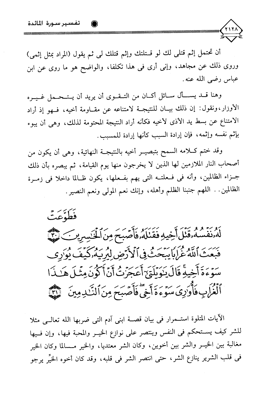 (فَطَوَّعَتْ لَهُ نَفْسُهُ قَتْلَ أَخِيهِ فَقَتَلَهُ فَأَصْبَحَ مِنَ الْخَاسِرِينَ (30) فَبَعَثَ اللَّهُ غُرَابًا يَبْحَثُ فِي الْأَرْضِ لِيُرِيَهُ كَيْفَ يُوَارِي سَوْءَةَ أَخِيهِ قَالَ يَا وَيْلَتَى أَعَجَزْتُ أَنْ أَكُونَ مِثْلَ هَذَا الْغُرَابِ فَأُوَارِيَ سَوْءَةَ أَخِي فَأَصْبَحَ مِنَ النَّادِمِينَ (31)