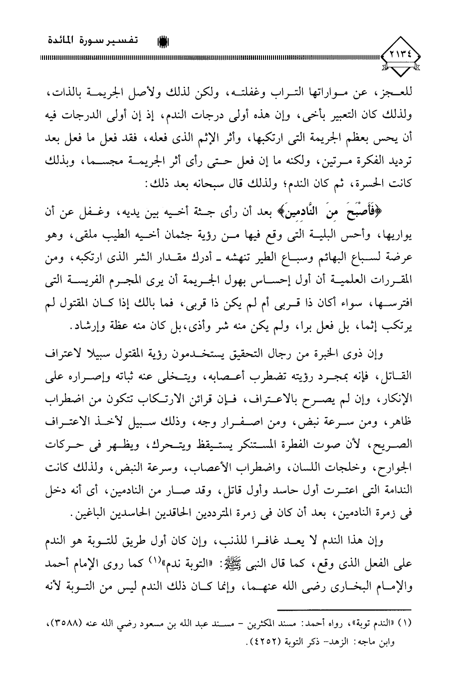 (فَأَصْبَحَ مِنَ النَّادِمِينَ) بعد أن رأى جثة أخيه بين يديه، وغفل عن أن يواريها، وأحس البلية التي وقع فيها من رؤية جثمان أخيه الطيب ملقى، وهو عرضة لسباع البهائم وسباع الطير تنهشه - أدرك مقدار الشر الذي ارتكبه، ومن المقررات العلمية أن أول إحساس بهول الجريمة أن يرى المجرم الفريسة التي افترسها، سواء أكان ذا قربى أم لم يكن ذا قربى، فما بالك إذا كان المقتول لم يرتكب إثما، بل فعل برا، ولم يكن منه شر وأذى، بل كان منه عظة وإرشاد. وإن ذوي الخبرة من رجال التحقيق يستخدمون رؤية المقتول سبيلا لاعتراف القاتل، فإنه بمجرد رؤيته تضطرب أعصابه، ويتخلى عنه ثباته وإصراره على الإنكار، وإن لم يصرح بالاعتراف، فإن قرائن الارتكاب تتكون من اضطراب ظاهر، ومن سرعة نبض، ومن اصفرار وجه، وذلك سبيل لأخذ الاعتراف الصريح، لأن صوت الفطرة المستنكر يستيقظ ويتحرك، ويظهر في حركات الجوارح، وخلجات اللسان، واضطراب الأعصاب، وسرعة النبض، ولذلك كانت الندامة التي اعترت أول حاسد وأول قاتل، وقد صار من النادمين، أي أنه دخل في زمرة النادمين، بعد أن كان في زمرة المترددين الحاقدين الحاسدين الباغين.