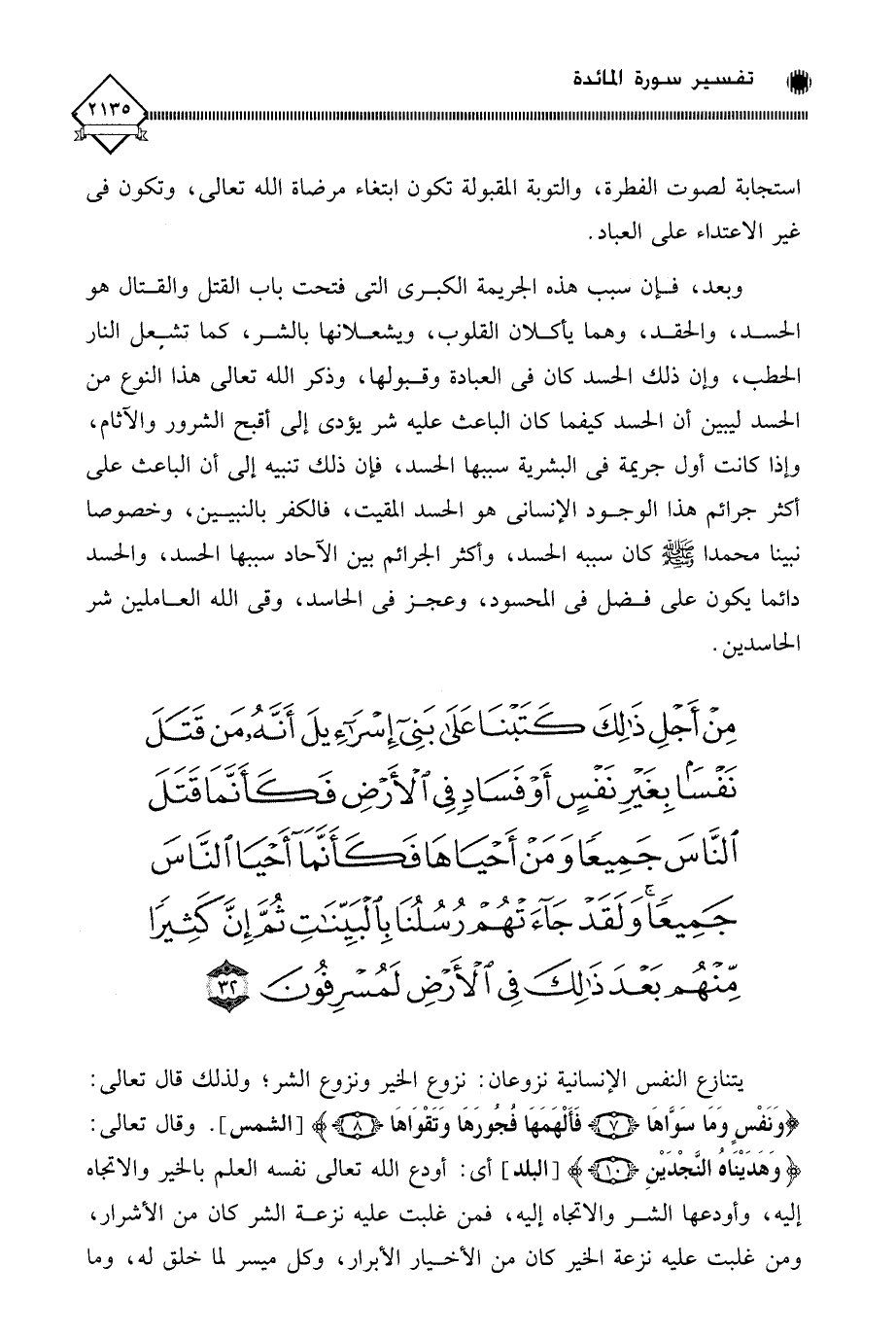 (مِنْ أَجْلِ ذَلِكَ كَتَبْنَا عَلَى بَنِي إِسْرَائِيلَ أَنَّهُ مَنْ قَتَلَ نَفْسًا بِغَيْرِ نَفْسٍ أَوْ فَسَادٍ فِي الْأَرْضِ فَكَأَنَّمَا قَتَلَ النَّاسَ جَمِيعًا وَمَنْ أَحْيَاهَا فَكَأَنَّمَا أَحْيَا النَّاسَ جَمِيعًا وَلَقَدْ جَاءَتْهُمْ رُسُلُنَا بِالْبَيِّنَاتِ ثُمَّ إِنَّ كَثِيرًا مِنْهُمْ بَعْدَ ذَلِكَ فِي الْأَرْضِ لَمُسْرِفُونَ (32)