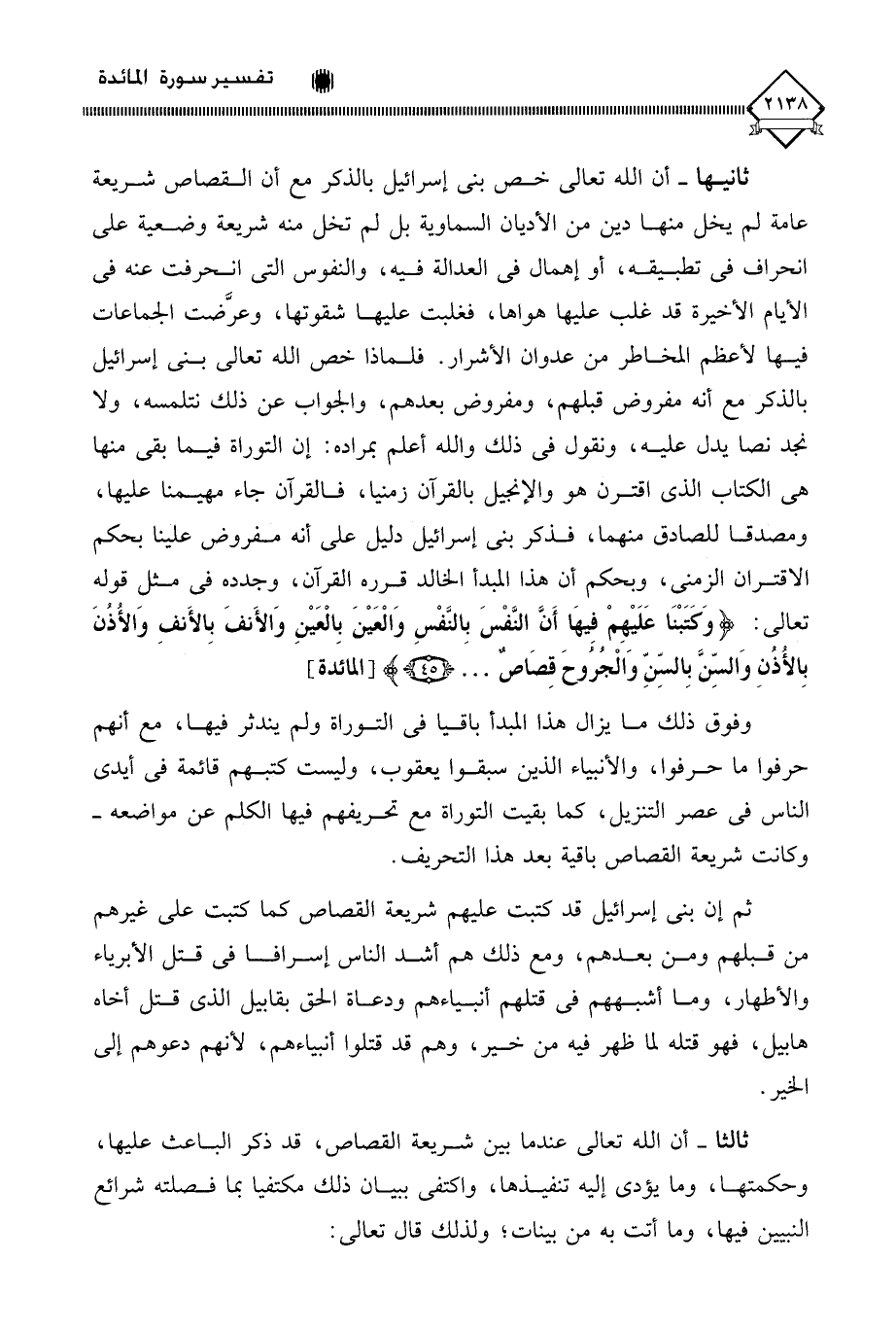 ثانيها - أن الله تعالى خص بني إسرائيل بالذكر مع أن القصاص شريعة عامة لم يخل منها دين من الأديان السماوية بل لم تخل منه شريعة وضعية على انحراف في تطبيقه، أو إهمال في العدالة فيه، والنفوس التي انحرفت عنه في الأيام الأخيرة قد غلب عليها هواها، فغلبت عليها شقوتها، وعرَّضت الجماعات فيها لأعظم المخاطر من عدوان الأشرار. فلماذا خص الله تعالى بني إسرائيل بالذكر مع أنه مفروض قبلهم، ومفروض بعدهم، والجواب عن ذلك نتلمسه، ولا نجد نصا يدل عليه، ونقول في ذلك والله أعلم بمراده: إن التوراة فيما بقي منها هي الكتاب الذي اقترن هو والإنجيل بالفرآن زمنيا، فالقرآن جاء مهيمنا عليها، ومصدقا للصادق منهما، فذكر بني إسرائيل دليل على أنه مفروض علينا بحكم الاقتران الزمني، وبحكم أن هذا المبدأ الخالد قرره القرآن، وجدده في مثل قوله تعالى: (وَكتَبْنَا عَلَيْهِمْ فِيهَا أَنَّ النَّفْسَ بِالنَّفْسِ وَالْعَيْنَ بِالْعَيْنِ وَالأَنفَ بِالأَنفِ وَالأُذُنَ بِالأُذُنِ وَالسِّنَّ بِالسِّنِّ وَالْجُرُوحَ قِصاصٌ. . .).