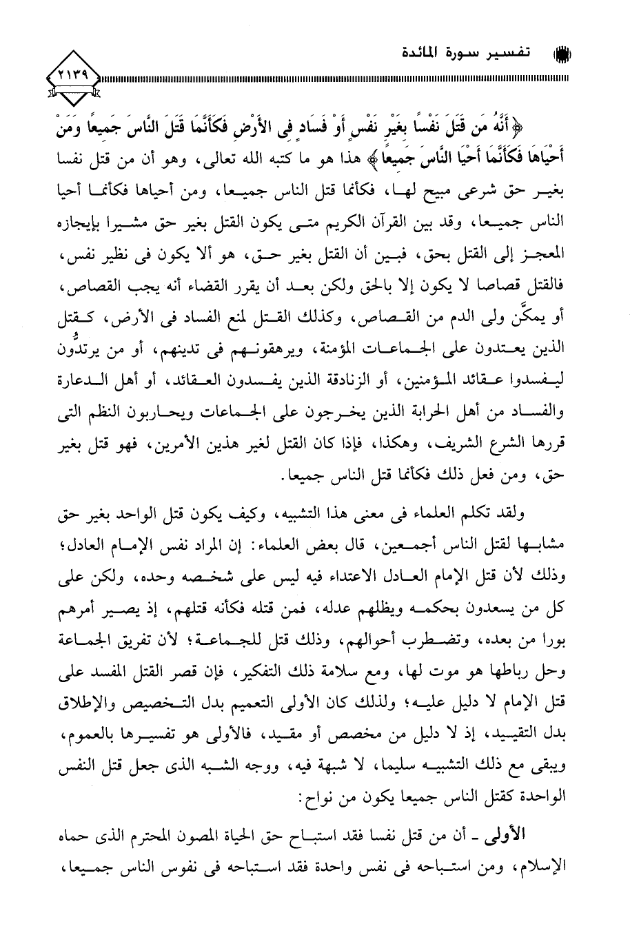 ولقد تكلم العلماء في معنى هذا التشبيه، وكيف يكون قتل الواحد بغير حق مشابها لقتل الناس أجمعين، قال بعض العلماء: إن المراد نفس الإمام العادل؛ وذلك لأن قتل الإمام العادل الاعتداء فيه ليس على شخصه وحده، ولكن على كل من يسعدون بحكمه ويظلهم عدله، فمن قتله فكأنه قتلهم، إذ يصير أمرهم بورا من بعده، وتضطرب أحوالهم، وذلك قتل للجماعة؛ لأن تفريق الجماعة وحل رباطها هو موت لها، ومع سلامة ذلك التفكير، فإن قصر القتل المفسد على قتل الإمام لَا دليل عليه؛ ولذلك كان الأولى التعميم بدل التخصيص والإطلاق بدل التقييد، إذ لَا دليل من مخصص أو مقيد، فالأولى هو تفسيرها بالعموم، ويبقى مع ذلك التشبيه سليما، لَا شبهة فيه، ووجه الشبه الذي جعل قتل النفس الواحدة كقتل الناس جميعا يكون من نواح: