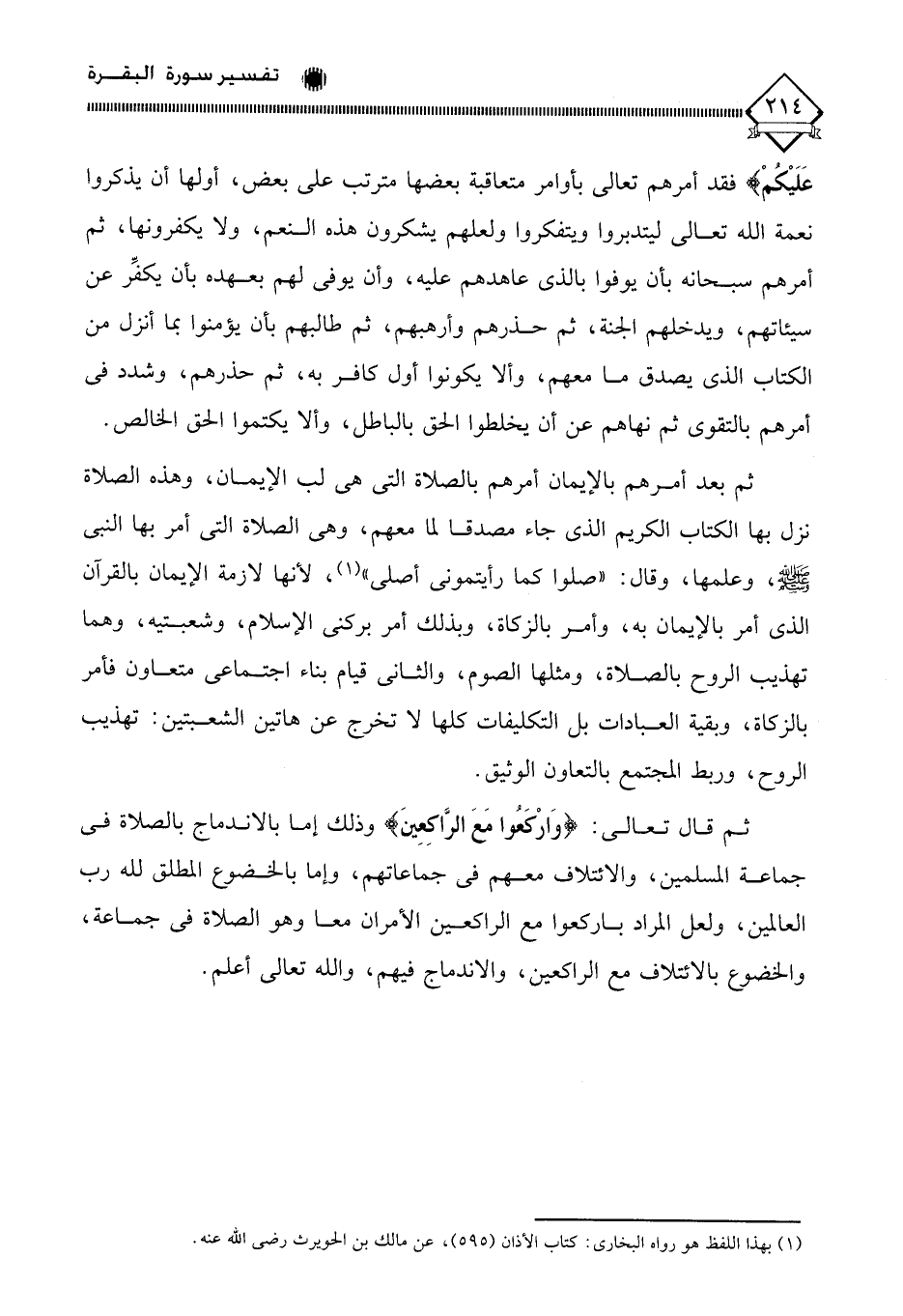 ثم بعد أمرهم بالإيمان أمرهم بالصلاة التي هي لب الإيمان، وهذه الصلاة نزل بها الكتاب الكريم الذي جاء مصدقا لما معهم، وهي الصلاة التي أمر بها النبي - صلى الله عليه وسلم -، وعلمها، وقال: " صلوا كما رأيتموني أصلي " (¬1)، لأنها لازمة الإيمان بالقرآن الذي أمر بالإيمان به، وأمر بالزكاة، وبذلك أمر بركني الإسلام، وشعبتيه، وهما تهذيب الروح بالصلاة، ومثلها الصوم، والثاني قيام بناء اجتماعي متعاون فأمر بالزكاة، وبقية العبادات بل التكليفات كلها لَا تخرج عن هاتين الشعبتين: تهذيب الروح، وربط المجتمع بالتعاون الوثيق.