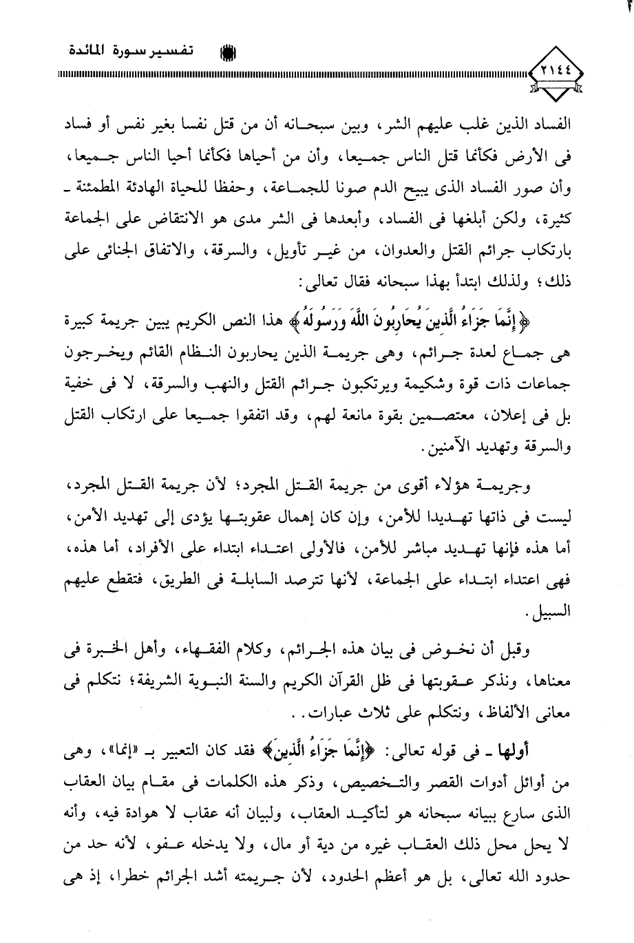 (إِنَّمَا جَزَاء الِّذِينَ يُحَارِبونَ اللَّهَ وَرَسُولَهُ) هذا النص الكريم يبين جريمة كبيرة هي جماع لعدة جرائم، وهي جريمة الذين يحاربون النظام القائم ويخرجون جماعات ذات قوة وشكيمة ويرتكبون جرائم القتل والنهب والسرقة، لَا في خفية بل في إعلان، معتصمين بقوة مانعة لهم، وقد اتفقوا جميعا على ارتكاب القتل والسرقة وتهديد الآمنين.