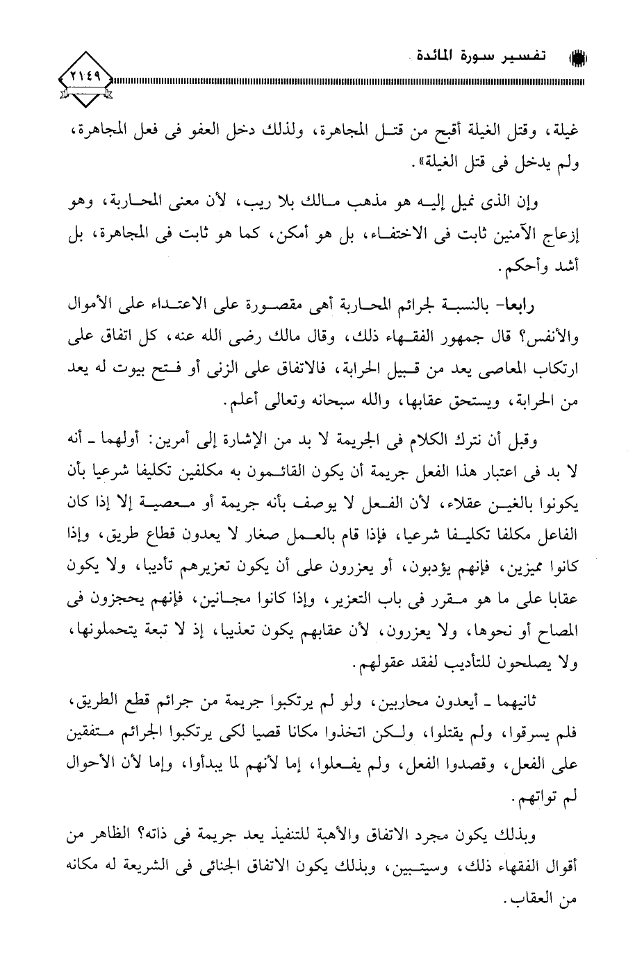 وإن الذي نميل إليه هو مذهب مالك بلا ريب، لأن معنى المحاربة، وهو إزعاج الآمنين ثابت في الاختفاء، بل هو أمكن، كما هو ثابت في المجاهرة، بل أشد وأحكم.