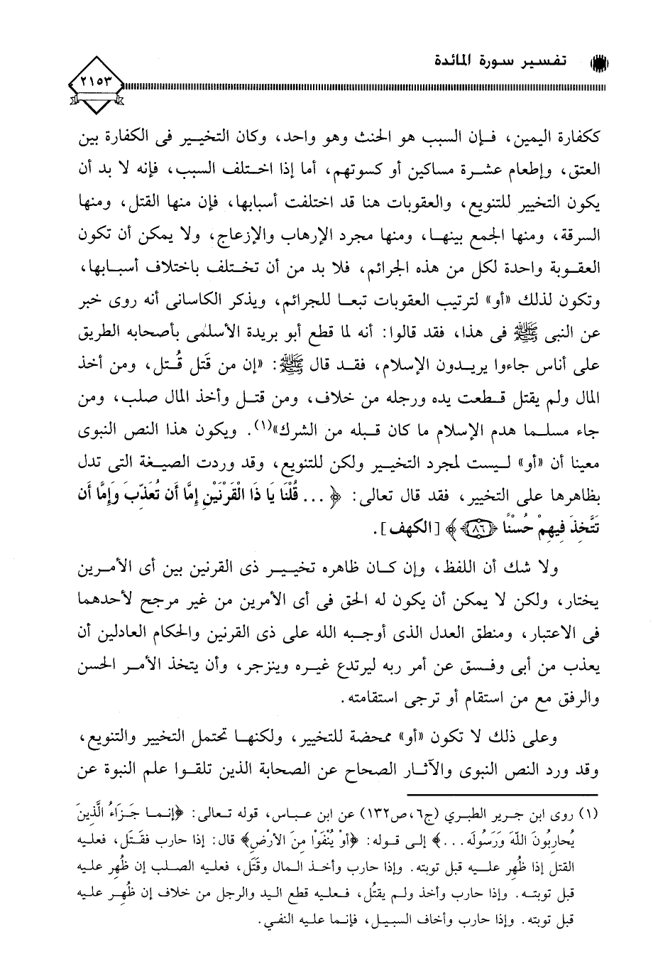 ككفارة اليمين، فإن السبب هو الحنث وهو واحد، وكان التخيير في الكفارة بين العتق، وإطعام عشرة مساكين أو كسوتهم، أما إذا اختلف السبب، فإنه لَا بد أن يكون التخيير للتنويع، والعقوبات هنا قد اختلفت أسبابها، فإن منها القتل، ومنها السرقة، ومنها الجمع بينها، ومنها مجرد الإرهاب والإزعاج، ولا يمكن أن تكون العقوبة واحدة لكل من هذه الجرائم، فلا بد من أن تختلف باختلاف أسبابها، وتكون لذلك " أو " لترتيب العقوبات تبعا للجرائم، ويذكر الكاساني أنه روي خبر عن النبي - صلى الله عليه وسلم - في هذا، فقد قالوا: أنه لما قطع أبو بريدة الأسلمي بأصحابه الطريق على أناس جاءوا يريدون الإسلام، فقد قال - صلى الله عليه وسلم -: " إن من قَتل قُتل، ومن أخذ المال ولم يقتل قطعت يده ورجله من خلاف، ومن قتل وأخذ المال صلب، ومن جاء مسلما هدم الإسلام ما كان قبله من الشرك " (¬1). ويكون هذا النص النبوي معينا أن " أو " ليست لمجرد التخيير ولكن للتنويع، وقد وردت الصيغة التي تدل بظاهرها على التخيير، فقد قال تعالى: (. . . قُلْنَا يَا ذَا الْقَرْنَيْنِ إِمَّا أَن تُعَذِّبَ وَإِمَّا أَن تَتَّخِذَ فِيهِمْ حُسْنًا).