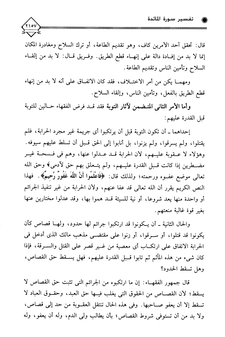والحال الثانية - أن يكونوا قد ارتكبوا جرائم لها حدود، ولها قصاص كأن يكونوا قد قتلوا، أو سرقوا، أو زنوا على مقتضى مذهب مالك الذي أدخل في الحرابة الاتفاق على ارتكاب أي معصية من غير قصر على القتل والسرقة، فإذا كان شيء من هذه المآثم ثم تابوا قبل القدرة عليهم، فهل يسقط حق القصاص، وهل تسقط الحدود؟
