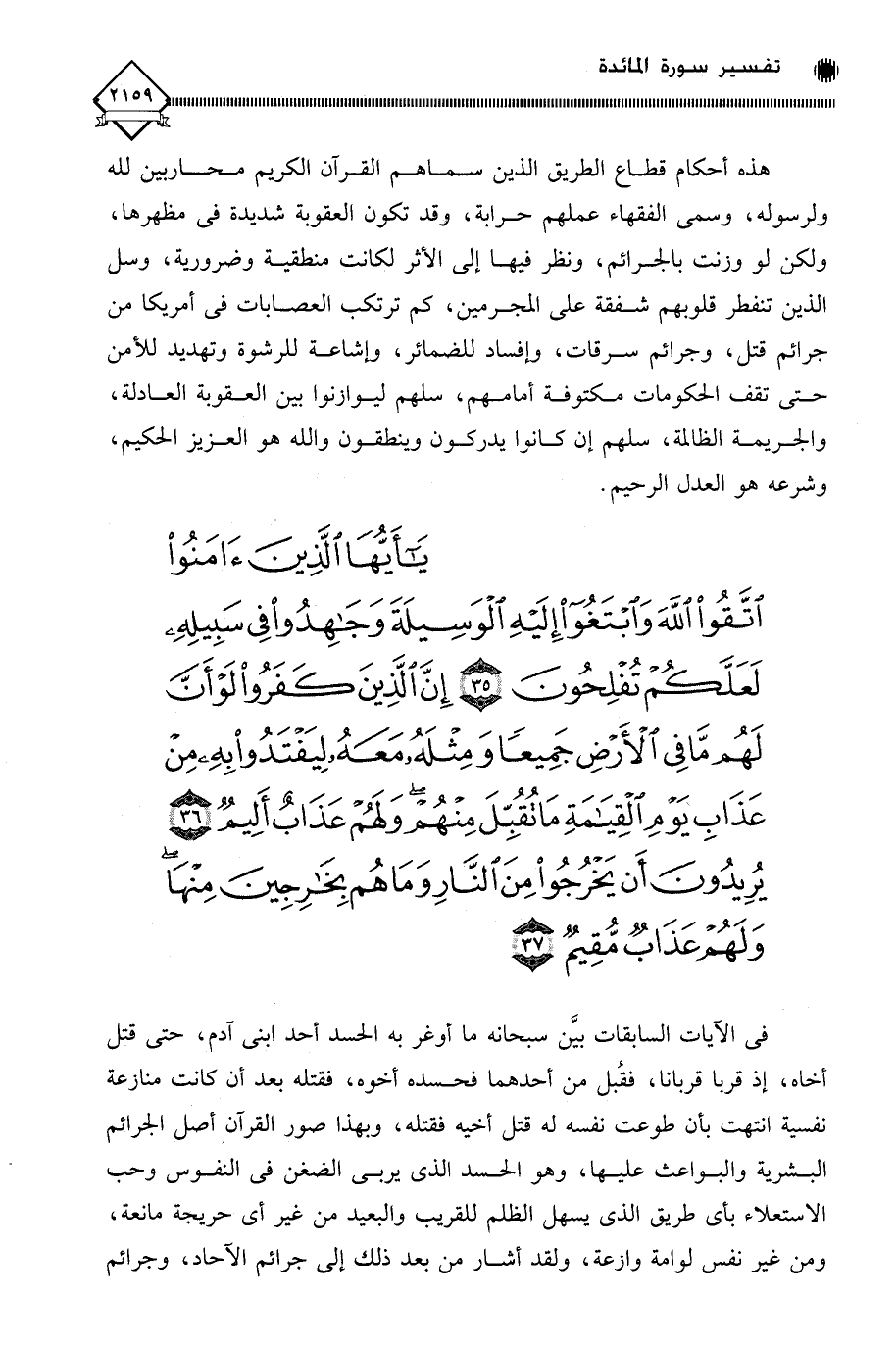 هذه أحكام قطاع الطريق الذين سماهم القرآن الكريم محاربين لله ولرسوله، وسمى الفقهاء عملهم حرابة، وقد تكون العقوبة شديدة في مظهرها، ولكن لو وزنت بالجرائم، ونظر فيها إلى الأثر لكانت منطقية وضرورية، وسل الذين تنفطر قلوبهم شفقة على المجرمين، كم ترتكب العصابات في أمريكا من جرائم قتل، وجرائم سرقات، وإفساد للضمائر، وإشاعة للرشوة وتهديد للأمن حتى تقف الحكومات مكتوفة أمامهم، سلهم ليوازنوا بين العقوبة العادلة، والجريمة الظالمة، سلهم إن كانوا يدركون وينطقون والله هو العزيز الحكيم، وشرعه هو العدل الرحيم.