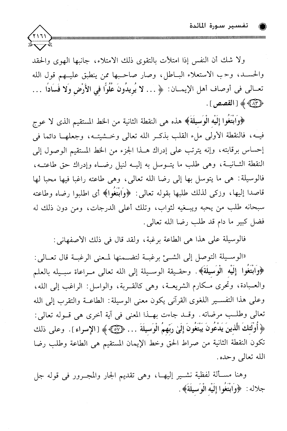 فالوسيلة على هذا هي الطاعة برغبة، ولقد قال في ذلك الأصفهاني: " الوسيلة التوصل إلى الشيء برغبة لتضمنها لمعنى الرغبة قال تعالى: (وَابْتَغُوا إِلَيْهِ الْوَسِيلَةَ). وحقيقة الوسيلة إلى الله تعالى مراعاة سبيله بالعلم والعبادة، وتحري مكارم الشريعة، وهي كالقربة، والواسل: الراغب إلى الله، وعلى هذا التفسير اللغوي القرآني يكون معنى الوسيلة: الطاعة والتقرب إلى الله تعالى وطلب مرضاته. وقد جاءت بهذا المعنى في آية أخرى هي قوله تعالى: (أُوْلَئِكَ الَّذِينَ يَدْعُونَ يَبْتَغُونَ إِلَى رَبِّهِمُ الْوَسِيلَةَ. . .). وعلى ذلك تكون النقطة الثانية من صراط الحق وخط الإيمان المستقيم هي الطاعة وطلب رضا الله تعالى وحده.