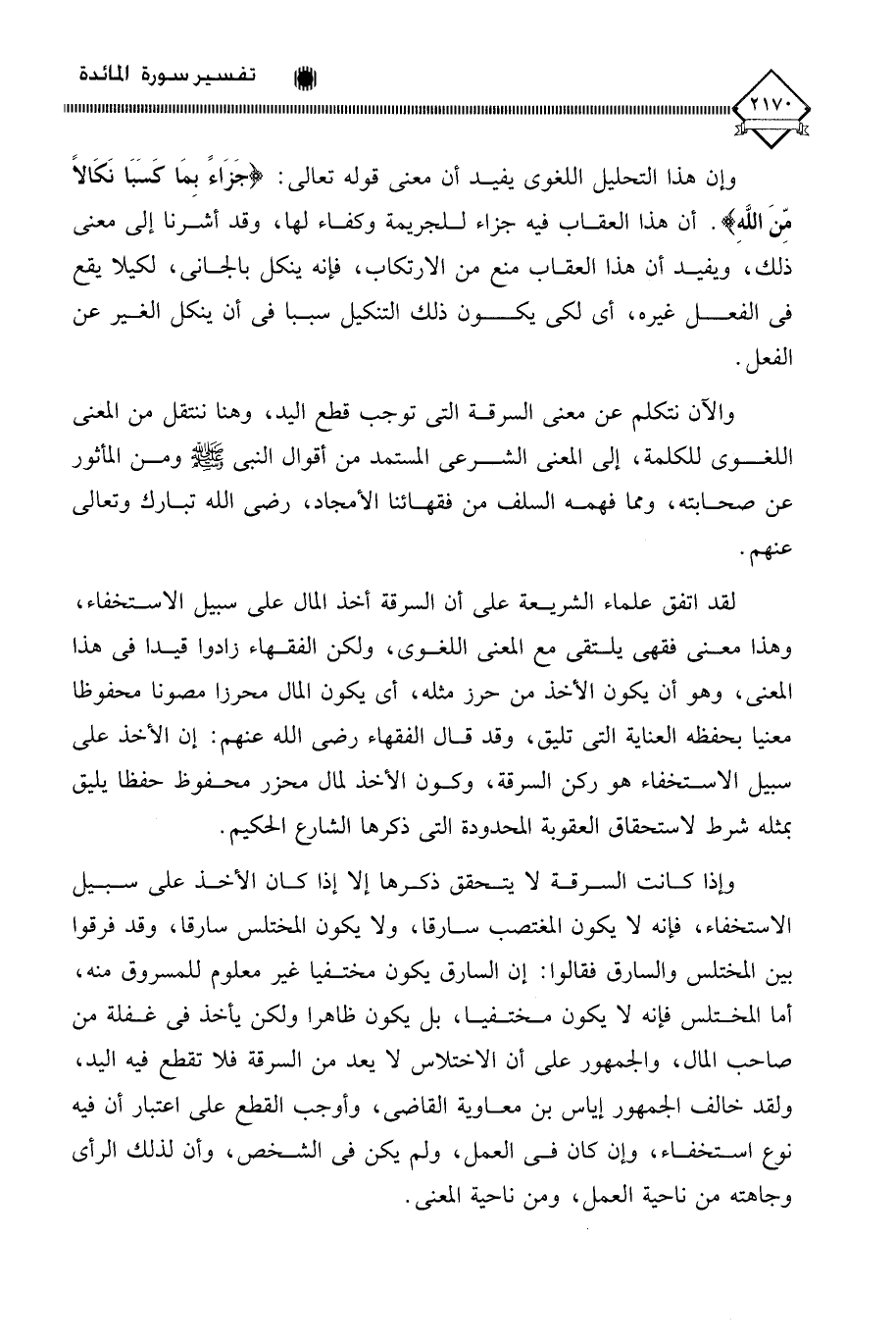 والآن نتكلم عن معنى السرقة التي توجب قطع اليد، وهنا ننتقل من المعنى اللغوي للكلمة، إلى المعنى الشرعي المستمد من أقوال النبي - صلى الله عليه وسلم - ومن المأثور عن صحابته، ومما فهمه السلف من فقهائنا الأمجاد، رضي الله تبارك وتعالى عنهم.