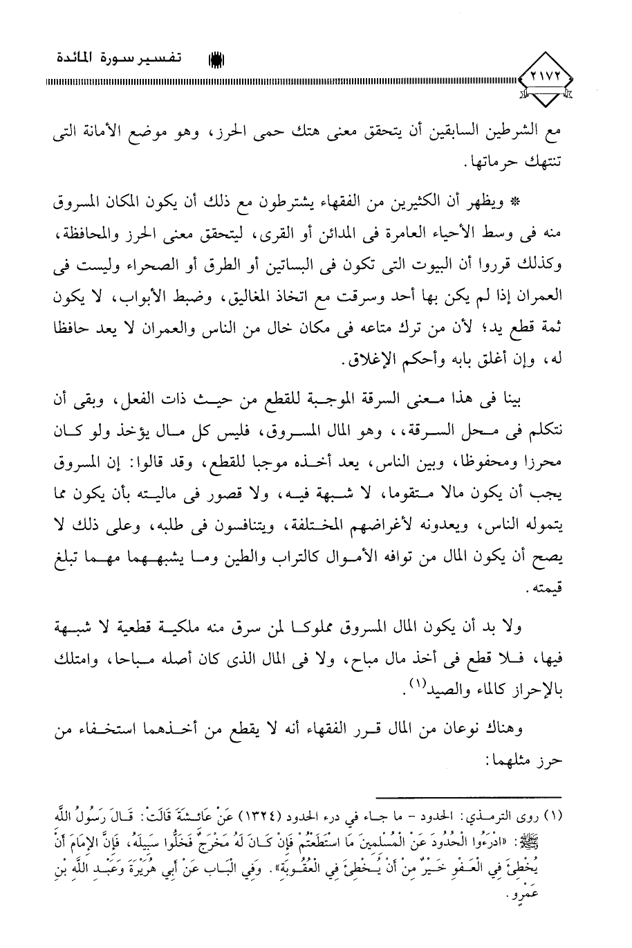 * ويظهر أن الكثيرين من الفقهاء يشترطون مع ذلك أن يكون المكان المسروق منه في وسط الأحياء العامرة في المدائن أو القرى، ليتحقق معنى الحرز والمحافظة، وكذلك قرروا أن البيوت التي تكون في البساتين أو الطرق أو الصحراء وليست في العمران إذا لم يكن بها أحد وسرقت مع اتخاذ المغاليق، وضبط الأبواب، لَا يكون ثمة قطع يد؛ لأن من ترك متاعه في مكان خال من الناس والعمران لَا يعد حافظا له، وإن أغلق بابه وأحكم الإغلاق.
