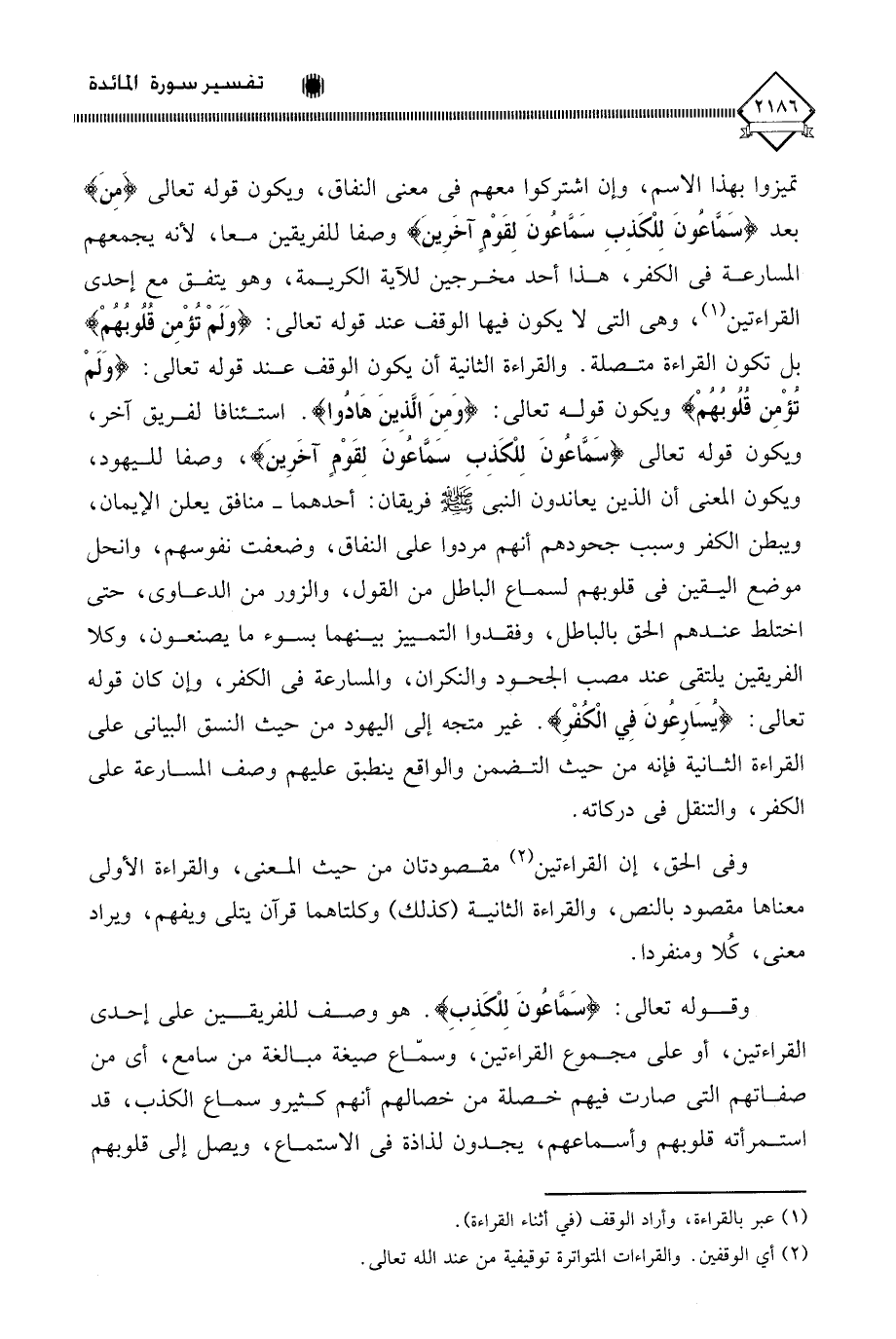 تميزوا بهذا الاسم، وإن اشتركوا معهم في معنى النفاق، ويكون قوله تعالى (مِنَ) بعد (سَمَّاعُونَ لِلْكَذِبِ سَمَّاعُونَ لِقَوْمٍ آخَرِينَ) وصفا للفريقين معا، لأنه يجمعهم المسارعة في الكفر، هذا أحد مخرجين للآية الكريمة، وهو يتفق مع إحدى القراءتين (¬1)، وهي التي لَا يكون فيها الوقف عند قوله تعالى: (وَلَمْ تُؤْمِن قُلُوبُهُمْ) بل تكون القراءة متصلة. والقراءة الثانية أن يكون الوقف عند قوله تعالى: (وَلَمْ تُؤْمِن قُلُوبُهُمْ) ويكون قوله تعالى: (وَمِنَ الَّذِينَ هَادُوا). استئنافا لفريق آخر، ويكون قوله تعالى (سَمَّاعُونَ لِلْكَذِبِ سَمَّاعُونَ لِقَوْمٍ آخَرِينَ)، وصفا لليهود، ويكون المعنى أن الذين يعاندون النبي - صلى الله عليه وسلم - فريقان: أحدهما - منافق يعلن الإيمان، ويبطن الكفر وسبب جحودهم أنهم مردوا على النفاق، وضعفت نفوسهم، وانحل موضع اليقين في قلوبهم لسماع الباطل من القول، والزور من الدعاوى، حتى اختلط عندهم الحق بالباطل، وفقدوا التمييز بينهما بسوء ما يصنعون، وكلا الفريقين يلتقي عند مصب الجحود والنكران، والمسارعة في الكفر، وإن كان قوله تعالى: (يُسَارِعُونَ فِي الْكُفْرِ). غير متجه إلى اليهود من حيث النسق البياني على القراءة الثانية فإنه من حيث التضمن والواقع ينطبق عليهم وصف المسارعة على الكفر، والتنقل في دركاته.