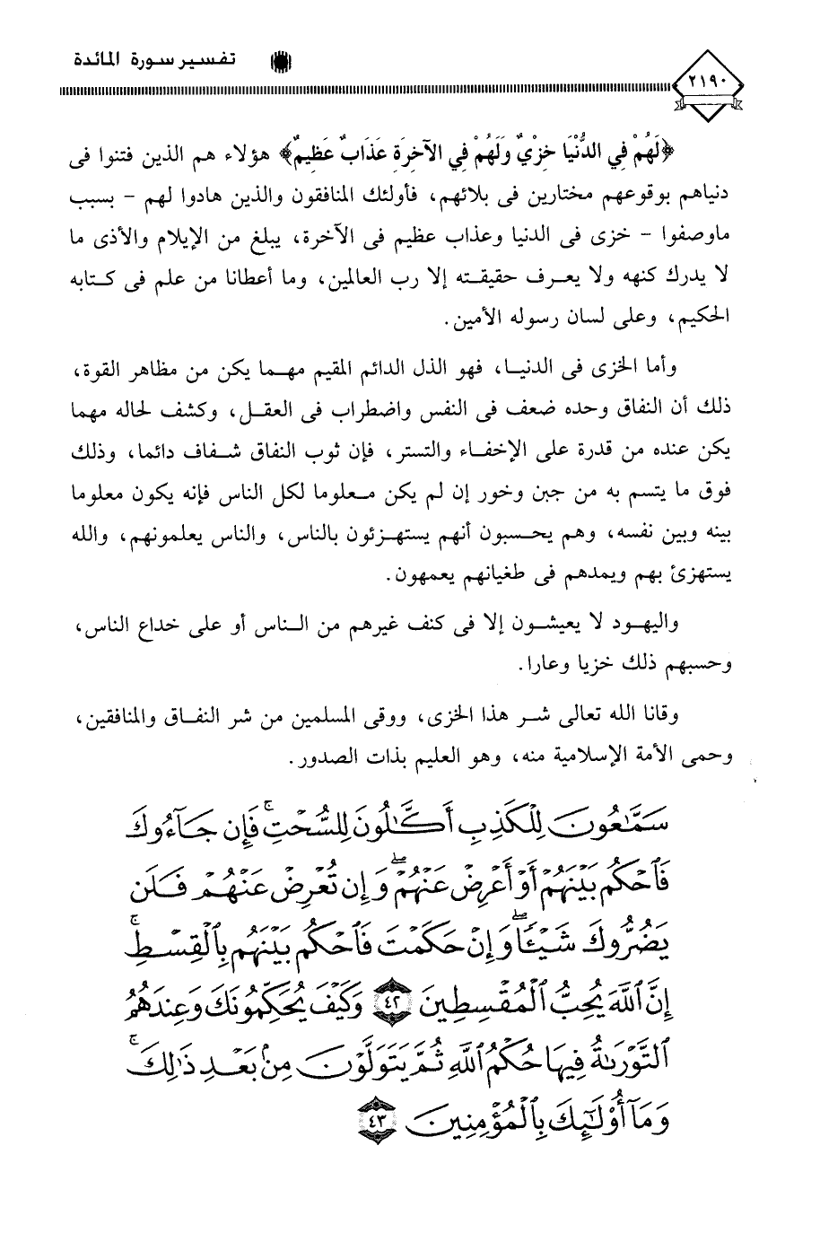 (سَمَّاعُونَ لِلْكَذِبِ أَكَّالُونَ لِلسُّحْتِ فَإِنْ جَاءُوكَ فَاحْكُمْ بَيْنَهُمْ أَوْ أَعْرِضْ عَنْهُمْ وَإِنْ تُعْرِضْ عَنْهُمْ فَلَنْ يَضُرُّوكَ شَيْئًا وَإِنْ حَكَمْتَ فَاحْكُمْ بَيْنَهُمْ بِالْقِسْطِ إِنَّ اللَّهَ يُحِبُّ الْمُقْسِطِينَ (42) وَكَيْفَ يُحَكِّمُونَكَ وَعِنْدَهُمُ التَّوْرَاةُ فِيهَا حُكْمُ اللَّهِ ثُمَّ يَتَوَلَّوْنَ مِنْ بَعْدِ ذَلِكَ وَمَا أُولَئِكَ بِالْمُؤْمِنِينَ (43)