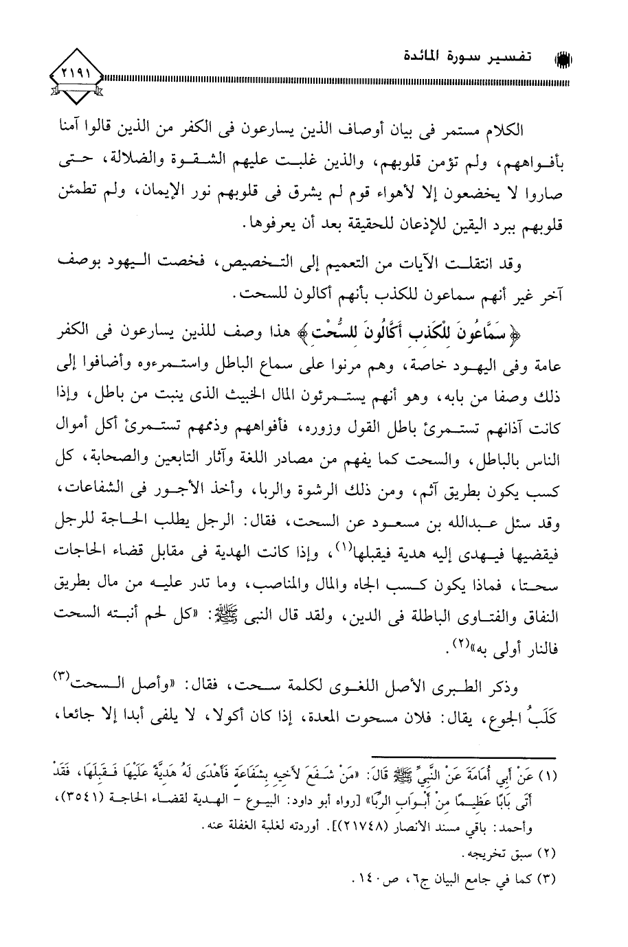 (سَمَّاعُونَ لِلْكَذِبِ أَكَّالُونَ لِلسُّحْتِ) هذا وصف للذين يسارعون في الكفر عامة وفي اليهود خاصة، وهم مرنوا على سماع الباطل واستمرءوه وأضافوا إلى ذلك وصفا من بابه، وهو أنهم يستمرئون المال الخبيث الذي ينبت من باطل، وإذا كانت آذانهم تستمرئ باطل القول وزوره، فأفواههم وذممهم تستمرئ أكل أموال الناس بالباطل، والسحت كما يفهم من مصادر اللغة وآثار التابعين والصحابة، كل كسب يكون بطريق آثم، ومن ذلك الرشوة والربا، وأخذ الأجور في الشفاعات، وقد سئل عبد الله بن مسعود عن السحت، فقال: الرجل يطلب الحاجة للرجل فيقضيها فيهدي إليه هدية فيقبلها (¬1)، وإذا كانت الهدية في مقابل قضاء الحاجات سحتا، فماذا يكون كسب الجاه والمال والمناصب، وما تدر عليه من مال بطريق النفاق والفتاوى الباطلة في الدين، ولقد قال النبي - صلى الله عليه وسلم -: " كل لحم أنبته السحت فالنار أولى به " (¬2).