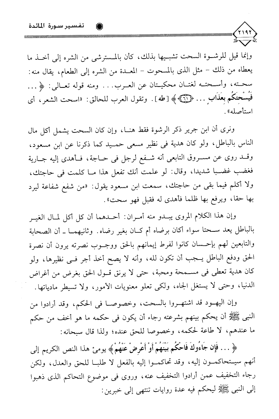 ونرى أن ابن جرير ذكر الرشوة فقط هنا، وإن كان السحت يشمل أكل مال الناس بالباطل، ولو كان هدية في نظير مسعى حميد كما ذكرنا عن ابن مسعود، وقد روي عن مسروق التابعي أنه شفع لرجل في حاجة، فأهدى إليه جارية فغضب غضبا شديدا، وقال: لو علمت أنك تفعل هذا ما كلمت في حاجتك، ولا أكلم فيما بقي من حاجتك، سمعت ابن مسعود يقول: " من شفع شفاعة ليرد بها حقا، ويرفع بها ظلما فأهدى له فقبل فهو سحت ".