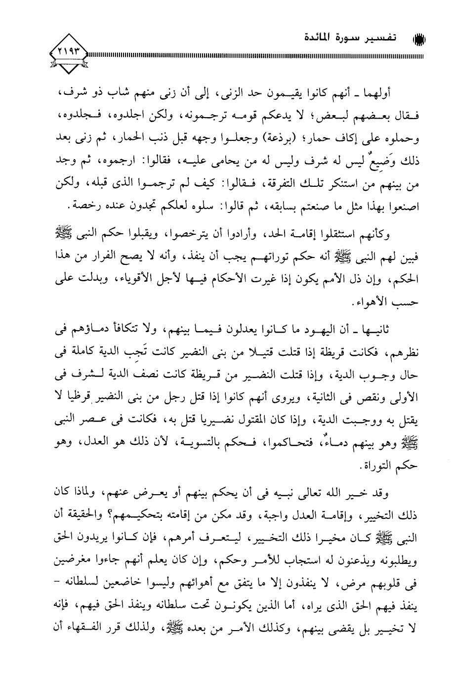 أولهما - أنهم كانوا يقيمون حد الزنى، إلى أن زنى منهم شاب ذو شرف، فقال بعضهم لبعض؛ لَا يدعكم قومه ترجمونه، ولكن اجلدوه، فجلدوه، وحملوه على إكاف حمار؛ (برذعة) وجعلوا وجهه قبل ذنب الحمار، ثم زنى بعد ذلك وَضِيعٌ ليس له شرف وليس له من يحامي عليه، فقالوا: ارجموه، ثم وجد من بينهم من استنكر تلك التفرقة، فقالوا: كيف لم ترجموا الذي قبله، ولكن اصنعوا بهذا مثل ما صنعتم بسابقه، ثم قالوا: سلوه لعلكم تجدون عنده رخصة. وكأنهم استثقلوا إقامة الحد، وأرادوا أن يترخصوا، ويقبلوا حكم النبي - صلى الله عليه وسلم - فبين لهم النبي - صلى الله عليه وسلم - أنه حكم توراتهم يجب أن ينفذ، وأنه لَا يصح الفرار من هذا الحكم، وإن ذل الأمم يكون إذا غيرت الأحكام فيها لأجل الأقوياء، وبدلت على حسب الأهواء.