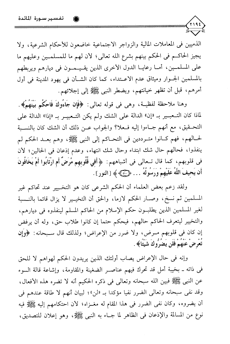 ولقد زعم بعض العلماء أن الحكم الشرعي كان هو التخيير عند تحاكم غير المسلمين ثم نسخ، وصار الحكم لازما، والحق أن التخيير لَا يزال قائما بالنسبة لغير المسلمين الذين يطلبون حكم الإسلام من الحاكم المسلم لينفذوه في ديارهم، والتخيير ليتعرف الحاكم حالهم، فيحكم حتما إن كانوا طلاب حق، وله أن يرفض إن كان في قلوبهم مرض، ولا ضرر من الإعراض، ولذلك قال سبحانه: (وَإِن تُعْرِضْ عَنْهُمْ فَلَن يَضُرُّوكَ شَيْئًا).