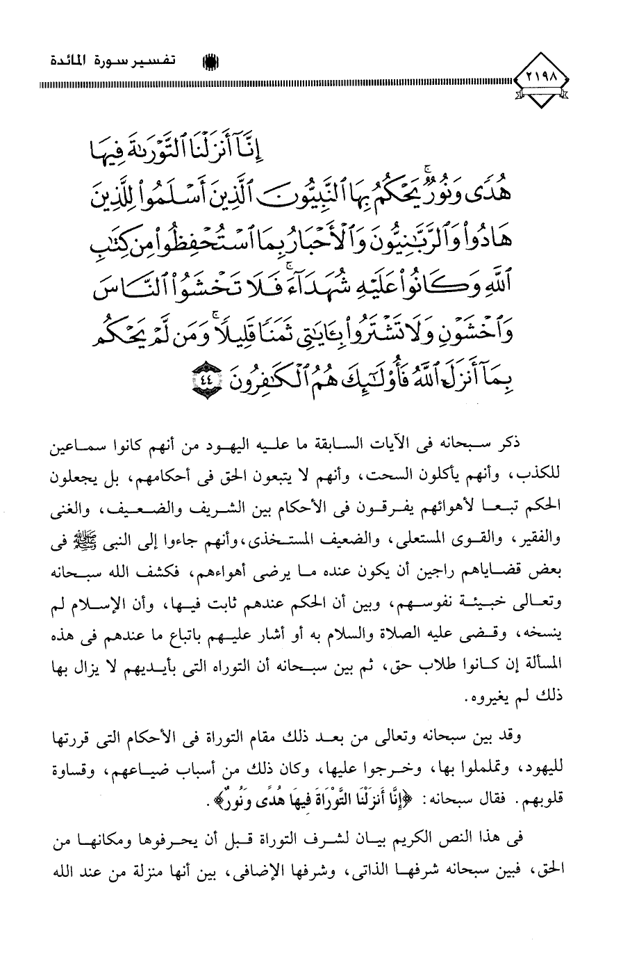 (إِنَّا أَنْزَلْنَا التَّوْرَاةَ فِيهَا هُدًى وَنُورٌ يَحْكُمُ بِهَا النَّبِيُّونَ الَّذِينَ أَسْلَمُوا لِلَّذِينَ هَادُوا وَالرَّبَّانِيُّونَ وَالْأَحْبَارُ بِمَا اسْتُحْفِظُوا مِنْ كِتَابِ اللَّهِ وَكَانُوا عَلَيْهِ شُهَدَاءَ فَلَا تَخْشَوُا النَّاسَ وَاخْشَوْنِ وَلَا تَشْتَرُوا بِآيَاتِي ثَمَنًا قَلِيلًا وَمَنْ لَمْ يَحْكُمْ بِمَا أَنْزَلَ اللَّهُ فَأُولَئِكَ هُمُ الْكَافِرُونَ (44)
