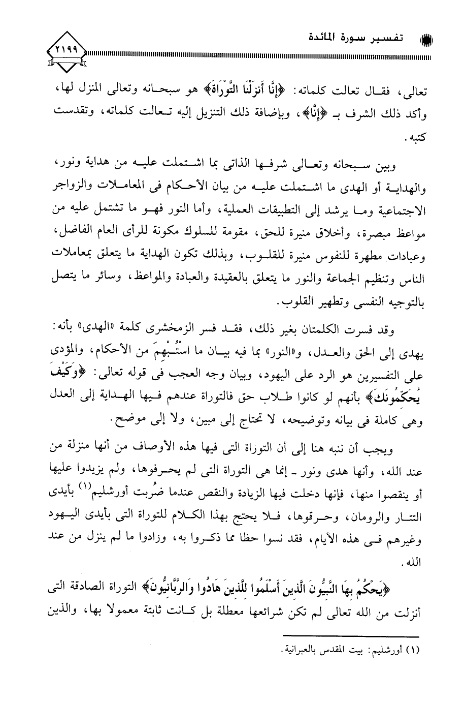 تعالى، فقال تعالت كلماته: (إِنَّا أَنزَلْنَا التَّوْرَاةَ) هو سبحانه وتعالى المنزل لها، وأكد ذلك الشرف بـ (إِنَّا)، وبإضافة ذلك التنزيل إلي " تعالت كلماته، وتقدست كتبه.