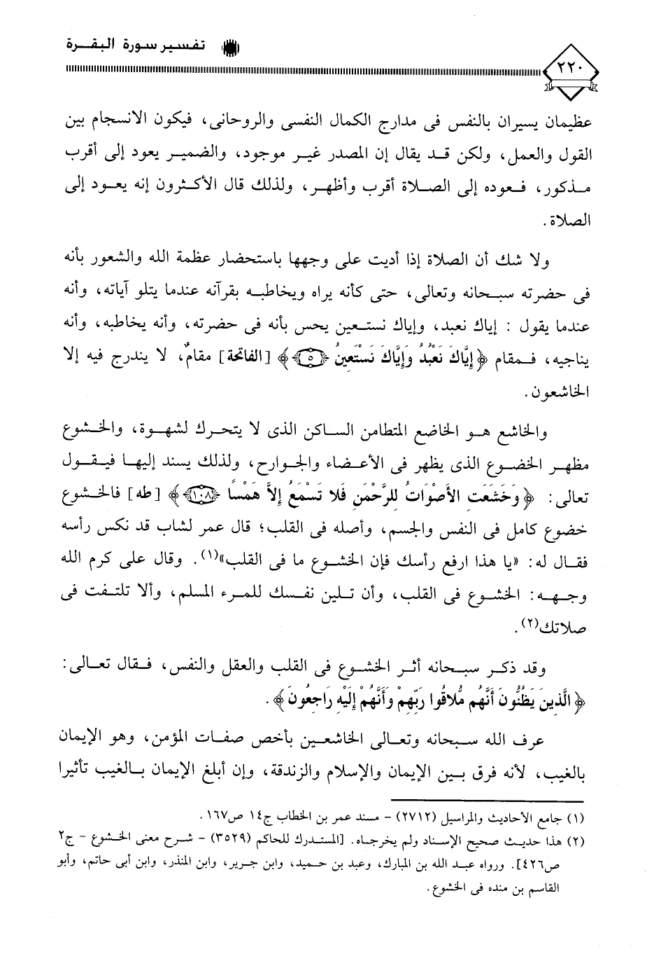 عرف الله سبحانه وتعالى الخاشعين بأخص صفات المؤمن، وهو الإيمان بالغيب، لأنه فرق بين الإيمان والإسلام والزندقة، وإن أبلغ الإيمان بالغيب تأثيرا