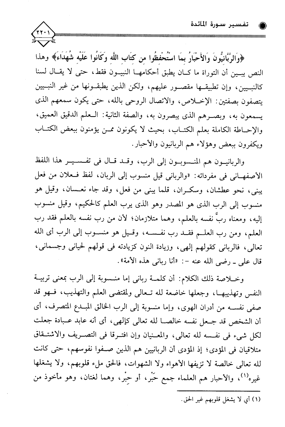 (وَالرَّبَّانِيُّونَ وَالْأَحْبَارُ بِمَا اسْتُحْفِظُوا مِنْ كِتَابِ اللَّهِ وَكَانُوا عَلَيْهِ شُهَدَاءَ) وهذا النص يبين أن التوراة ما كان يطبق أحكامها النبيون فقط، حتى لَا يقال لسنا كالنبيين، وإن تطبيقها مقصور عليهم، ولكن الذين يطبقونها من غير النبيين يتصفون بصفتين: الإخلاص، والاتصال الروحي بالله، حتى يكون سمعهم الذي يسمعون به، وبصرهم الذي يبصرون به، والصفة الثانية: العلم الدقيق العميق، والإحاطة الكاملة بعلم الكتاب، بحيث لَا يكونون ممن يؤمنون ببعض الكتاب ويكفرون ببعض وهؤلاء هم الربانيون والأحبار.