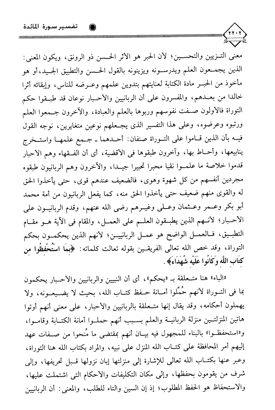 معنى التزيين والتحسين؛ لأن الحبر هو الأثر الحسن ذو الرونق، ويكون المعنى الذين يجمعون العلم ويدرسونه ويزينونه بالقول الحسن والتطبيق الجيد، أو هو مأخوذ من الحبر مادة الكتابة لعنايتهم بتدوين علمهم وعرضه للناس، وإبقائه أثرا خالدا من بعدهم، والمفسرون على أن الربانيين والأحبار نوعان قد طبقوا حكم التوراة فالأولون صفت نفوسهم وربوها بالعلم والعبادة، والآخرون جمعوا العلم ورتبوه وعرضوه، وعلى هذا التفسير الذي يجعلهم نوعين متغايرين، نوجه القول فيه بأن الذين قاموا على التوراة صنفان: أحدهما - جمع علمها واستخرج ينابيعها، وأحاط بها، وآخرون طبقوها في الأقضية، أي أن الفقهاء وهم الأحبار قدموا خلاصة ما علموا نقيا محبرا تحبيرا جيدا، والآخرون وهم الربانيون طبقوه مجردين أنفسهم من كل شهوة وهوى، فالضعيف عندهم قوي، حتى يأخذوا الحق له والقوي منهم ضعيف حتى يأخذوا الحق منه، كما يفعل الربانيون من أمة محمد أبو بكر وعمر وعثمان وعلي وغيرهم رضي الله عنهم، وقدم الربانيون على الأحبار؛ لأنهم الذين يطبقون العلم على العمل، والمقام في الآية هو مقام التطبيق، فالعمل الواضح هو عمل الربانيين؛ لأنهم الذين يحكمون بحكم التوراة، وقد خص الله تعالى الفريقين بقوله تعالت كلماته: (بمَا اسْتُحْفطوا من كتَابِ اللَّهِ وَكَانُوا عَلَيْهِ شُهَدَاءَ).