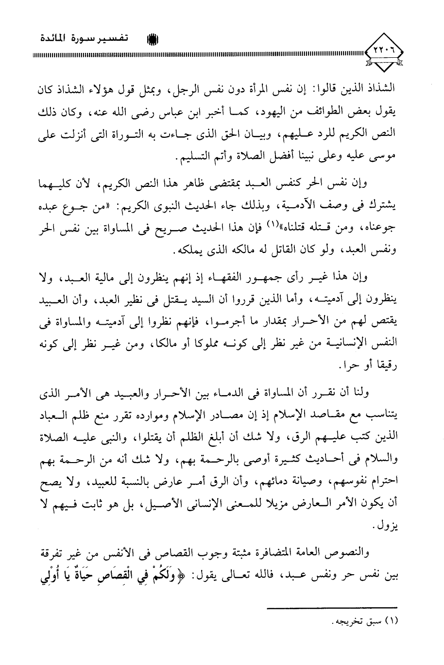 وإن هذا غير رأى جمهور الفقهاء إذ إنهم ينظرون إلى مالية العبد، ولا ينظرون إلى آدميته، وأما الذين قرروا أن السيد يقتل في نظير العبد، وأن العبيد يقتص لهم من الأحرار بمقدار ما أجرموا، فإنهم نظروا إلى آدميته والمساواة في النفس الإنسانية من غير نظر إلى كونه مملوكا أو مالكا، ومن غير نظر إلى كونه رقيقا أو حرا.
