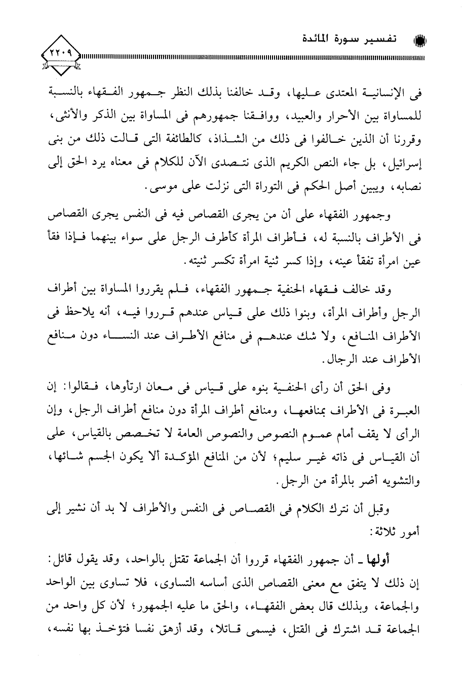 فى الإنسانية المعتدى عليها، وقد خالفنا بذلك النظر جمهور الفقهاء بالنسبة للمساواة بين الأحرار والعبيد، ووافقنا جمهورهم في المساواة بين الذكر والأنثى، وقررنا أن الذين خالفوا في ذلك من الشذاذ، كالطائفة التي قالت ذلك من بني إسرائيل، بل جاء النص الكريم الذي نتصدى الآن للكلام في معناه يرد الحق إلى نصابه، ويبين أصل الحكم في التوراة التي نزلت على موسى.