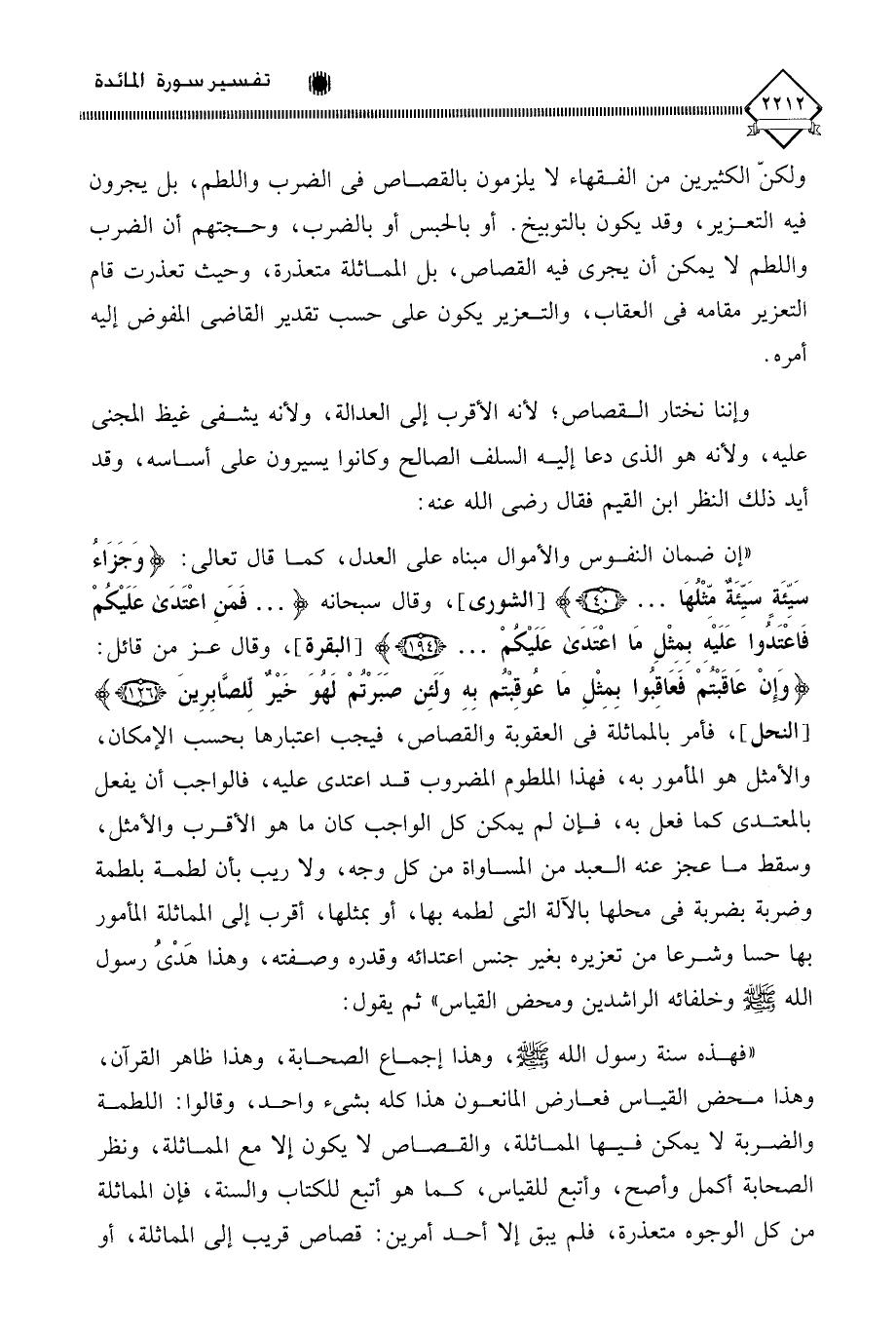" إن ضمان النفوس والأموال مبناه على العدل، كما قال تعالى: (وَجَزَاءُ سَيِّئَةٍ سَيِّئَةٌ مثْلُهَا. . .)، وقال سبحانه (. . . فَمَنِ اعْتَدَى عَلَيْكُمْ فَاعْتَدُوا عَلَيْهِ بِمِثْلِ مَا اعْتَدَى عَلَيْكُمْ. . .)، وقال عز من قائل: (وَإِنْ عَاقَبْتُمْ فَعَاقِبُوا بِمِثْلِ مَا عُوقِبْتُم بِهِ وَلَئِن صبرْتُمْ لَهُوَ خَيْرٌ للصَّابِرِينَ)