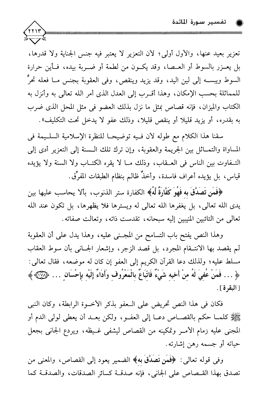 سقنا هذا الكلام مع طوله لأن فيه توضيحا للنظرة الإسلامية السليمة في المساواة والتماثل بين الجريمة والعقوبة، وإن ترك تلك السنة إلى التعزير أدى إلى التفاوت بين الناس في العقاب، وذلك ما لَا يقره الكتاب ولا السنة ولا يؤيده قياس، بل يؤيده أعراف فاسدة، وأخذ ظالم بنظام الطبقات المفرِّق. (فَمَن تَصَدَّقَ بِهِ فَهُوَ كفَّارَةٌ لهُ) الكفارة ستر الذنوب، بألا يحاسب عليها بين يدي الله تعالى، بل يغفرها الله تعالى له ويسترها فلا يظهرها، بل تكون عند الله تعالى من التائبين المنيبين إليه سبحانه، تقدست ذاته، وتعالت صفاته.