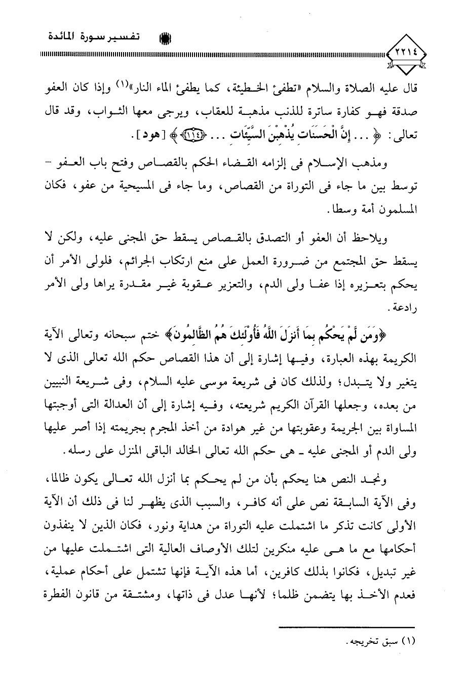 ونجد النص هنا يحكم بأن من لم يحكم بما أنزل الله تعالى يكون ظالما، وفى الآية السابقة نص على أنه كافر، والسبب الذي يظهر لنا في ذلك أن الآية الأولى كانت تذكر ما اشتملت عليه التوراة من هداية ونور، فكان الذين لَا ينفذون أحكامها مع ما هي عليه منكرين لتلك الأوصاف العالية التي اشتملت عليها من غير تبديل، فكانوا بذلك كافرين، أما هذه الآية فإنها تشتمل على أحكام عملية، فعدم الأخذ بها يتضمن ظلما؛ لأنها عدل في ذاتها، ومشتقة من قانون الفطرة