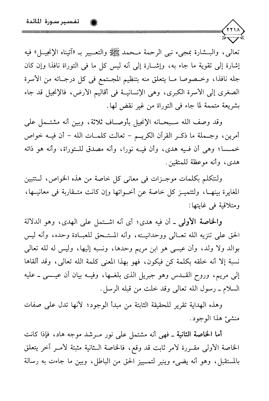 والخاصة الأولى - أن فيه هدى؛ أي أنه اشتمل على الهدى، وهو الدلالة الحق على تنزيه الله تعالى ووحدانيته، وأنه المستحق للعبادة وحده، وأنه ليس بوالد ولا ولد، وأن عيسى هو ابن مريم وحدها، ونسبه إليها، وليس له لله تعالى نسبة إلا أنه خلقه بكلمة كن فيكون، فهو بهذا المعنى كلمة الله تعالى، وقد ألقاها إلى مريم، وروح القدس وهو جبريل الذي بلغها، وفيه بيان أن عيسى - عليه السلام - رسول الله تعالى وقد خلت من قبله الرسل.