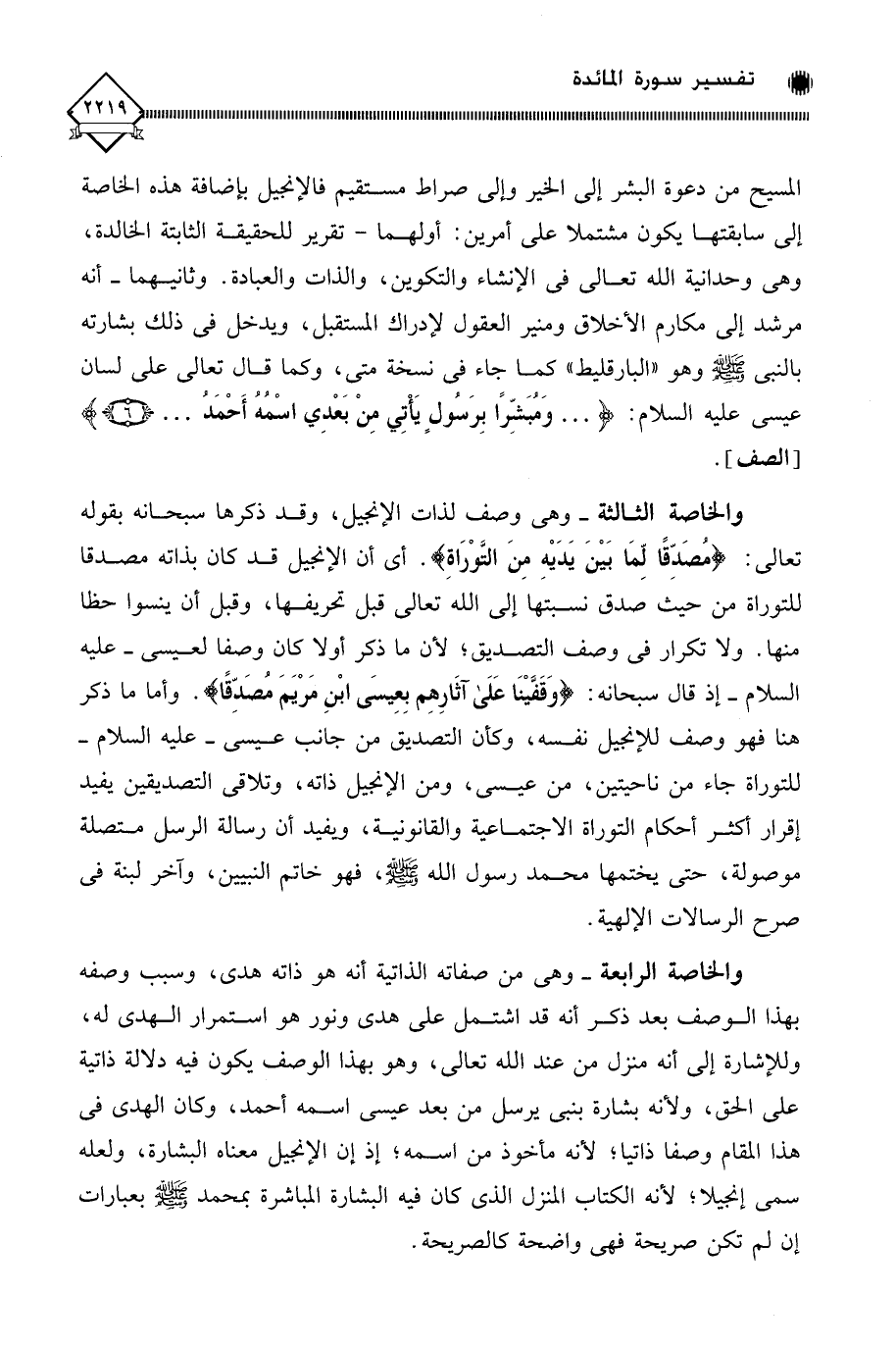 المسيح من دعوة البشر إلى الخير وإلى صراط مستقيم فالإنجيل بإضافة هذه الخاصة إلى سابقتها يكون مشتملا على أمرين: أولهما - تقرير للحقيقة الثابتة الخالدة، وهي وحدانية الله تعالى في الإنشاء والتكوين، والذات والعبادة. وثانيهما - أنه مرشد إلى مكارم الأخلاق ومنير العقول لإدراك المستقبل، ويدخل في ذلك بشارته بالنبي - صلى الله عليه وسلم - وهو " البارقليط " كما جاء في نسخة متى، وكما قال تعالى على لسان عيسى عليه السلام: (. . . وَمبَشِّرًا بِرَسولٍ يَأْتِي مِنْ بَعْدِي اسْمُهُ أَحْمَدُ. . .).