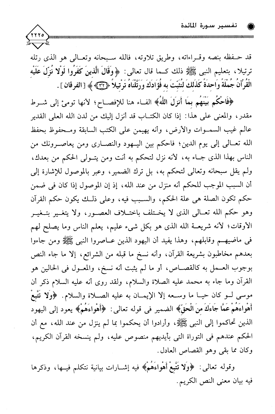 (فَاحْكُم بَيْنَهُم بِمَا أَنزَلَ اللَّهُ) الفاء هنا للإفصاح؛ لأنها تومئ إلى شرط مقدر، والمعنى على هذا: إذا كان الكتاب قد أنزل إليك من لدن الله العلي القدير عالم غيب السماوات والأرض، وأنه يهيمن على الكتب السابقة ومحفوظ بحفظ الله تعالى إلى يوم الدين؛ فاحكم بين اليهود والنصارى ومن يعاصرونك من الناس بهذا الذي جاء به، لأنه نزل لتحكم به أنت ومن يتولى الحكم من بعدك، ولم يقل سبحانه وتعالى لتحكم به، بل ترك الضمير، وعبر بالموصول للإشارة إلى أن السبب الموجب للحكم أنه منزل من عند الله، إذ إن الموصول إذا كان في ضمن حكم تكون الصلة هي علة الحكم، والسبب فيه، وعلى ذلك يكون حكم القرآن وهو حكم الله تعالى الذي لَا يختلف باختلاف العصور، ولا يتغير بتغير الأوقات؛ لأنه شريعة الله الذي هو بكل شيء عليم، يعلم الناس وما يصلح لهم في ماضيهم وقابلهم، وهذا يفيد أن اليهود الذين عاصروا النبي - صلى الله عليه وسلم - ومن جاءوا بعدهم مخاطبون بشريعة القرآن، وأنه نسخ ما قبله من الشرائع، إلا ما جاء النص بوجوب العمل به كالقصاص، أو ما لم يثبت أنه نسخ، والمعول في الحالين هو القرآن وما جاء به محمد عليه الصلاة والسلام، ولقد روى أنه عليه السلام ذكر أن موسى لو كان حيا ما وسعه إلا الإيمان به عليه الصلاة والسلام. (وَلا تَتَّبِعْ أَهْواءَهُمْ عَمَّا جَاءَكَ مِنَ الْحَقِّ) الضمير في قوله تعالى: (أَهْواءَهُمْ) يعود إلى اليهود الذين تحاكموا إلى النبي - صلى الله عليه وسلم -، وأرادوا أن يحكموا بما لم ينزل من عند الله، مع أن الحكم عندهم في التوراة التي بأيديهم منصوص عليه، ولم ينسخه القرآن الكريم، وكان مما بقي وهو القصاص العادل.