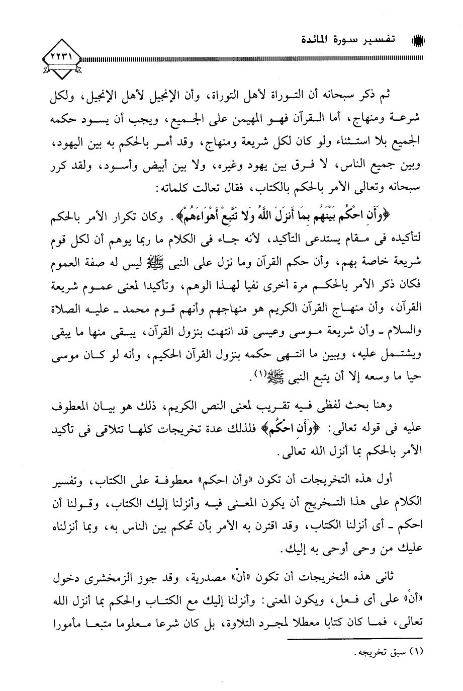 أول هذه التخريجات أن تكون " وأن احكم " معطوفة على الكتاب، وتفسير الكلام على هذا التخريج أن يكون المعنى فيه وأنزلنا إليك الكتاب، وقولنا أن احكم - أي أنزلنا الكتاب، وقد اقترن به الأمر بأن تحكم بين الناس به، وبما أنزلناه عليك من وحي أوحى به إليك.