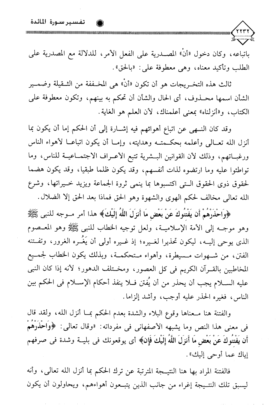 (وَاحْذَرْهُمْ أَنْ يَفْتِنُوكَ عَنْ بَعْضِ مَا أَنْزَلَ اللَّهُ إِلَيْكَ) هذا أمر موجه للنبي - صلى الله عليه وسلم - وهو موجه إلى الأمة الإسلامية، ولعل توجيه الخطاب للنبي - صلى الله عليه وسلم - وهو المعصوم الذي يوحى إليه، ليكون تحذيرا لغيره؛ إذ غيره أولى أن يَغُره الغرور، وتفتنه الفتن، من شهوات مسيطرة، وأهواء متحكمة، وبذلك يكون الخطاب لجميع المخاطبين بالقرآن الكريم في كل العصور، ومختلف الدهور؛ لأنه إذا كان النبي عليه السلام يجب أن يحذر من أن يُفتن فلا ينفذ أحكام الإسلام في الحكم بين الناس، فغيره الحذر عليه أوجب، وأشد إلزاما.