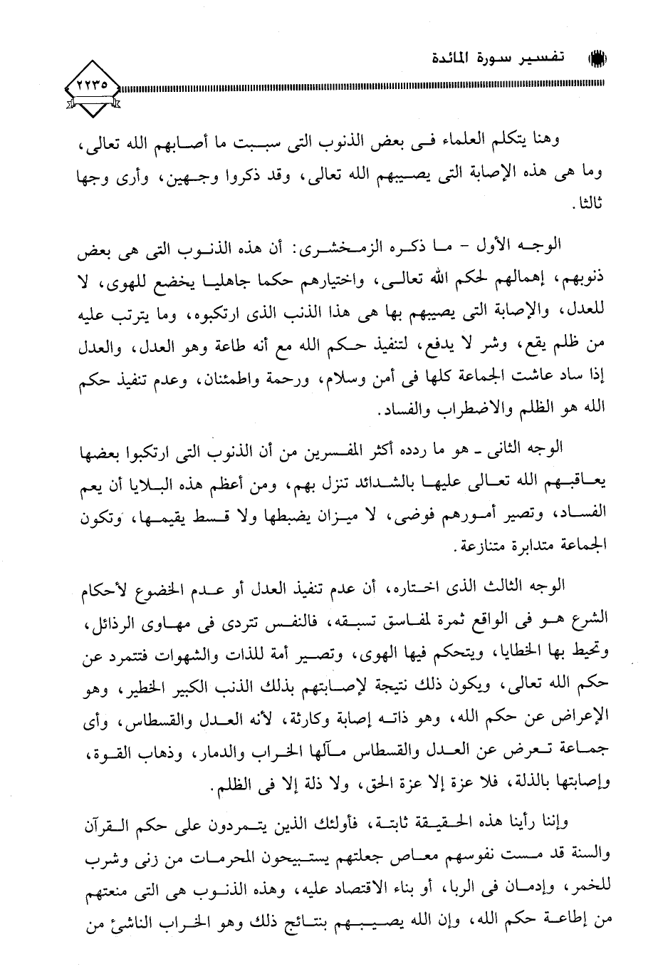 الوجه الثالث الذي اختاره، أن عدم تنفيذ العدل أو عدم الخضوع لأحكام الشرع هو في الواقع ثمرة لمفاسق تسبقه، فالنفس تتردى في مهاوي الرذائل، وتحيط بها الخطايا، ويتحكم فيها الهوى، وتصير أمة للذات والشهوات فتتمرد عن حكم الله تعالى، ويكون ذلك نتيجة لإصابتهم بذلك الذنب الكبير الخطير، وهو الإعراض عن حكم الله، وهو ذاته إصابة وكارثة، لأنه العدل والقسطاس، وأي جماعة تعرض عن العدل والقسطاس مآلها الخراب والدمار، وذهاب القوة، وإصابتها بالذلة، فلا عزة إلا عزة الحق، ولا ذلة إلا في الظلم.