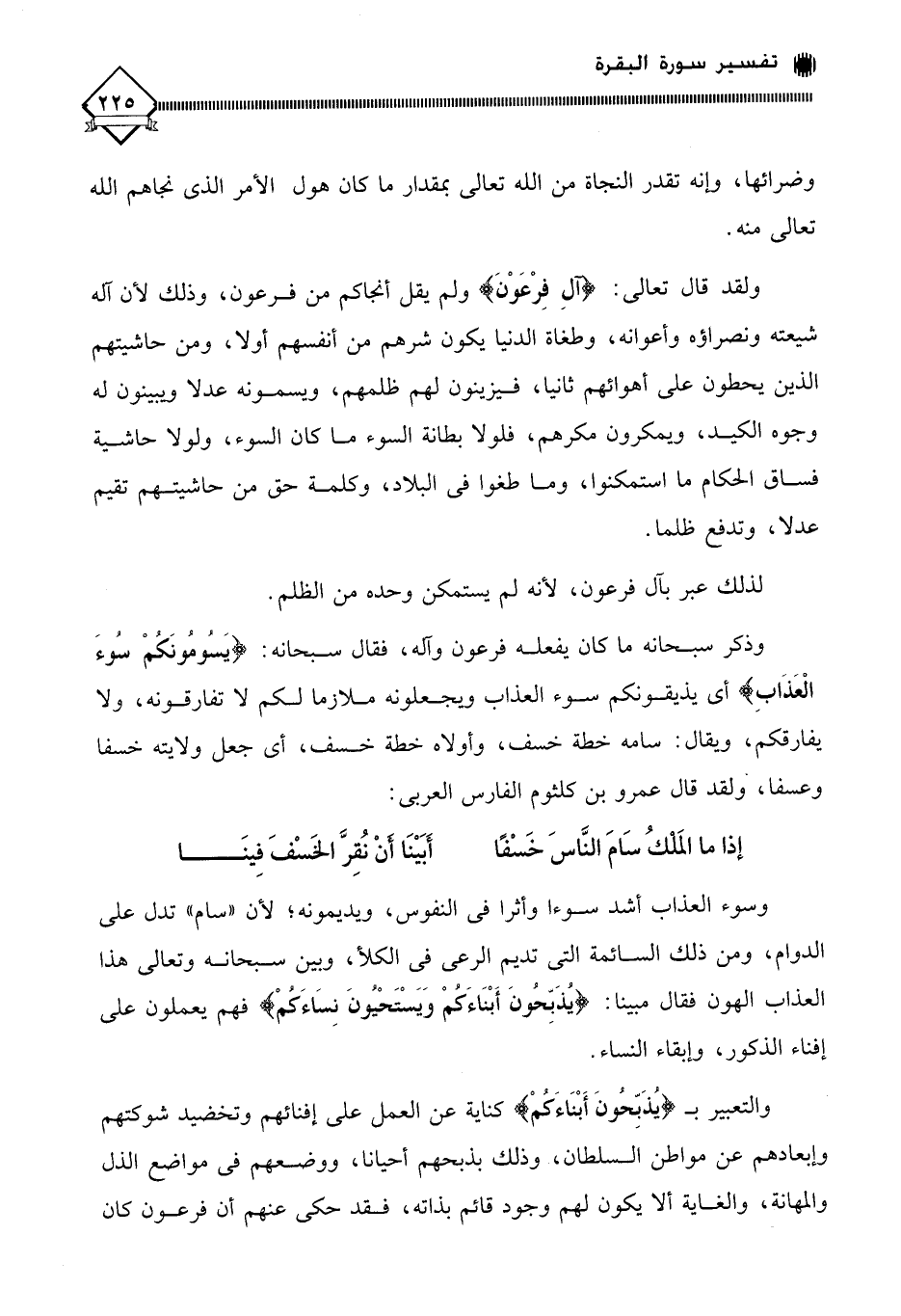 وذكر سبحانه ما كان يفعله فرعون وآله، فقال سبحانه: (يَسُومُونَكُمْ سُوءَ الْعَذَابِ) أي يذيقونكم سوء العذاب ويجعلونه ملازما لكم لَا تفارقونه، ولا يفارقكم، ويقال: سامه خطة خسف، وأولاه خطة خسف، أي جعل ولايته خسفا وعسفا، ولقد قال عمرو بن كلثوم الفارس العربي: