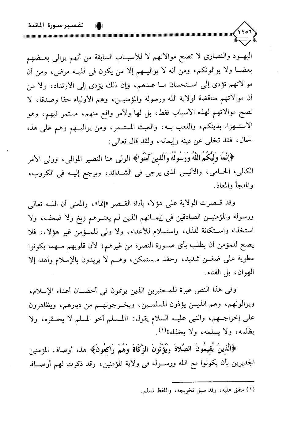 وفى هذا النص عبرة للمعتبرين الذين يرتمون في أحضان أعداء الإسلام، ويوالونهم، وهم الذين يؤذون المسلمين، ويخرجونهم من ديارهم، ويظاهرون على إخراجهم، والنبي عليه السلام يقول: " المسلم أخو المسلم لَا يحقره، ولا يظلمه، ولا يسلمه، ولا يخذله " (¬1).