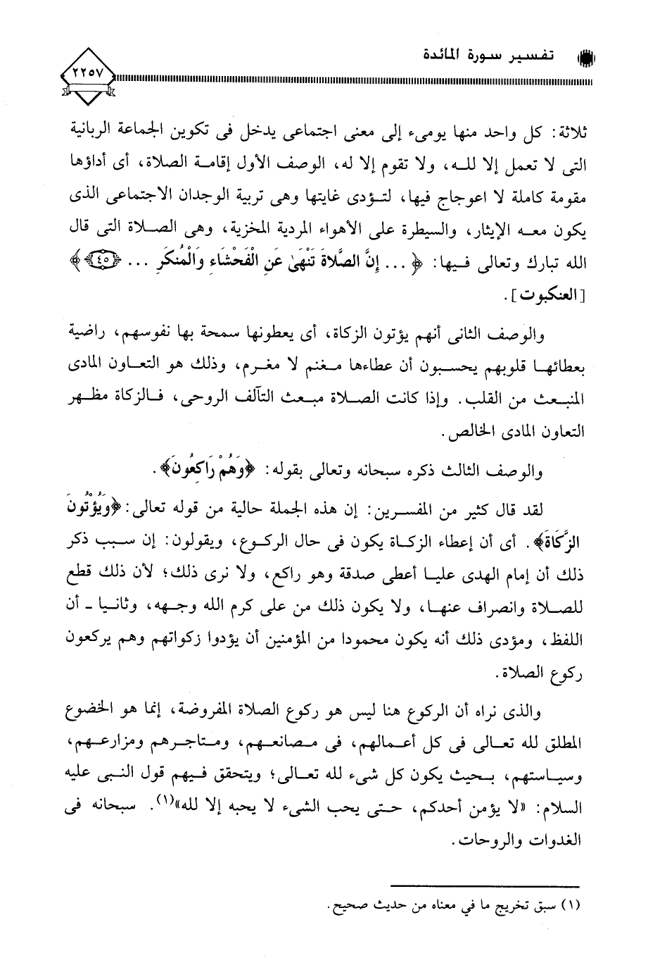 والذي نراه أن الركوع هنا ليس هو ركوع الصلاة المفروضة، إنما هو الخضوع المطلق لله تعالى في كل أعمالهم، في مصانعهم، ومتاجرهم ومزارعهم، وسياستهم، بحيث يكون كل شيء لله تعالى؛ ويتحقق فيهم قول النبي عليه السلام: " لا يؤمن أحدكم، حتى يحب الشيء لَا يحبه إلا لله " (¬1). سبحانه في الغدوات والروحات.