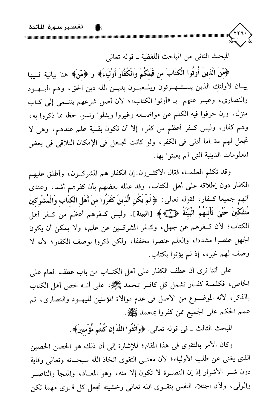 (مِّنَ الَّذِينَ أُوتُوا الْكِتَابَ مِن قَبْلِكُمْ وَالْكُفَّارَ أَوْلِيَاءَ) و (مِّنَ) هنا بيانية فيها بيان لأولئك الذين يستهزئون ويلعبون بدين الله دين الحق، وهم اليهود والنصارى، وعبر عنهم بـ " أوتوا الكتاب "؛ لأن أصل شرعهم ينتمي إلى كتاب منزل، وإن حرفوا فيه الكلم عن مواضعه وغيروا وبدلوا ونسوا حظا مما ذكروا به، وهم كفار، وليس كفر أعظم من كفر، إلا أن تكون بقية علم عندهم، وهي لا تجعل لهم مقاما أدنى في الكفر، ولو كانت تجعل في الإمكان التلاقي في بعض المعلومات الدينية التي لم يعبثوا بها.