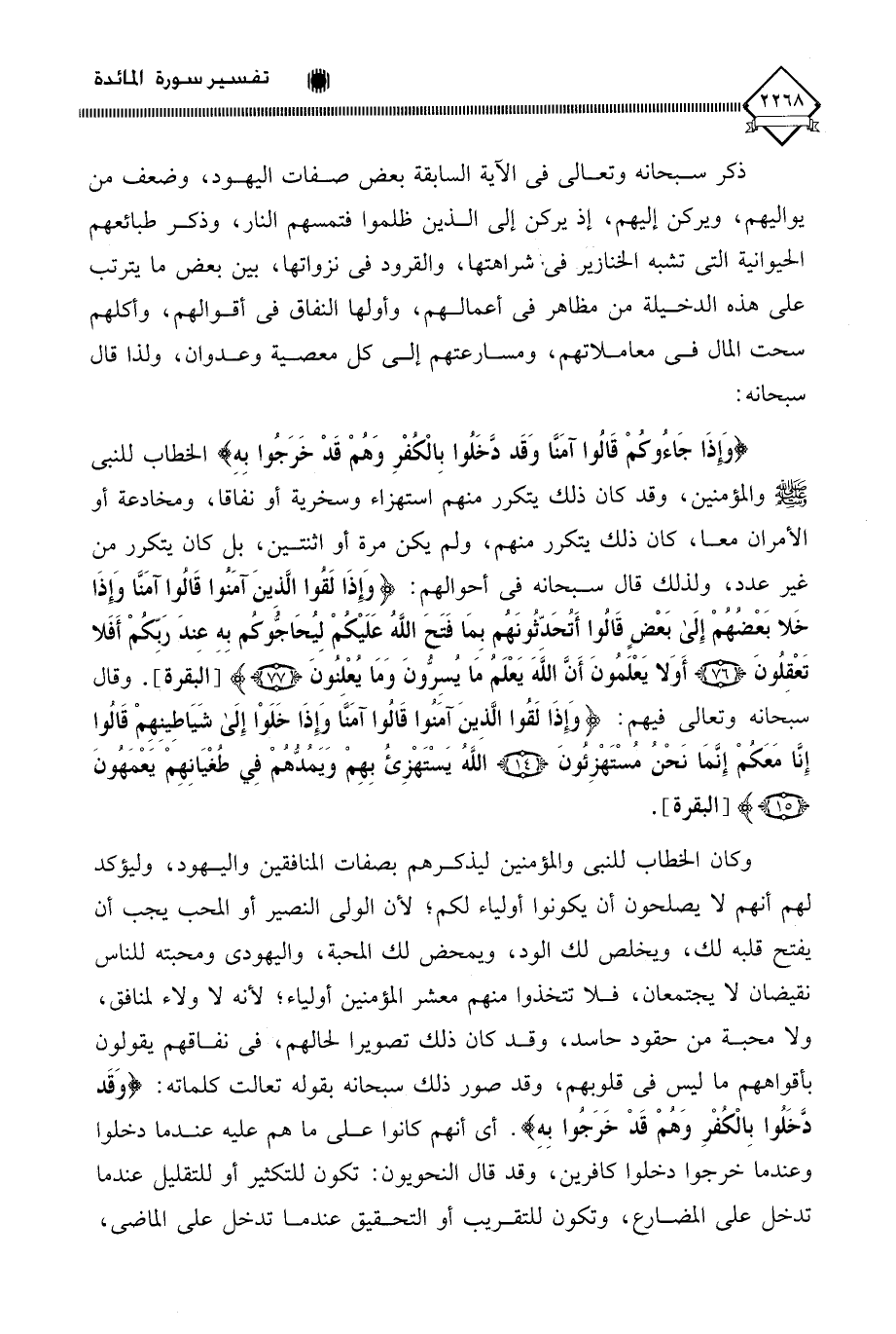 (وَإذَا جَاءُوكمْ قَالُوا آمَنَّا وَقَد دَّخَلُوا بِالْكُفْرِ وَهُمْ قَدْ خَرَجُوا بِهِ) الخطاب للنبي - صلى الله عليه وسلم - والمؤمنين، وقد كان ذلك يتكرر منهم استهزاء وسخرية أو نفاقا، ومخادعة أو الأمران معا، كان ذلك يتكرر منهم، ولم يكن مرة أو اثنتين، بل كان يتكرر من غير عدد، ولذلك قال سبحانه في أحوالهم: (وَإِذَا لَقُوا الَّذِينَ آمَنُوا قَالُوا آمَنَّا وَإِذَا خَلَا بَعْضُهُمْ إِلَى بَعْضٍ قَالُوا أَتُحَدِّثُونَهُمْ بِمَا فَتَحَ اللَّهُ عَلَيْكُمْ لِيُحَاجُّوكُمْ بِهِ عِنْدَ رَبِّكُمْ أَفَلَا تَعْقِلُونَ (76) أَوَلَا يَعْلَمُونَ أَنَّ اللَّهَ يَعْلَمُ مَا يُسِرُّونَ وَمَا يُعْلِنُونَ (77).