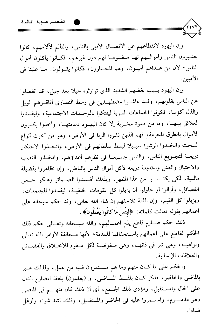 وإن اليهود لانقطاعهم عن الاتصال الأدبي بالناس، والتألم لآلامهم، كانوا يعتبرون الناس وأموالهم نهبا مقسوما لهم دون غيرهم، فكانوا يأكلون أموال الناس؛ لأن من عداهم أميون، وهم المختارون، فكانوا يقولون: ما علينا في الأميين.